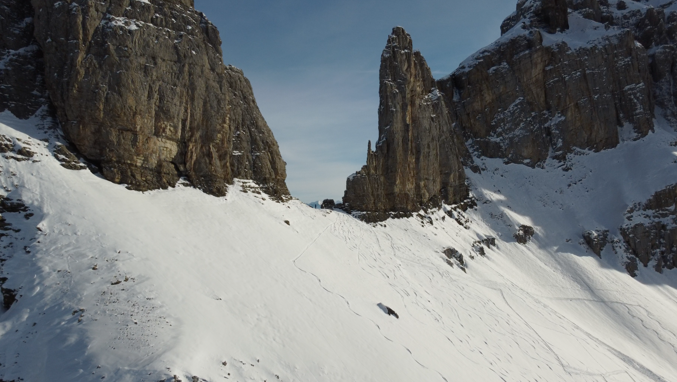 Gemütlicher Start unterhalb Schluecht. Der Skiroute folgend Richtung Mettener Butzli. Die Steilstufe ginge ohne Hilfsmittel, ich habe jedoch Harscheisen montiert. Zum Teil noch ein wenig Pulver gefunden im oberen Teil. Unten ziemlich hart.
