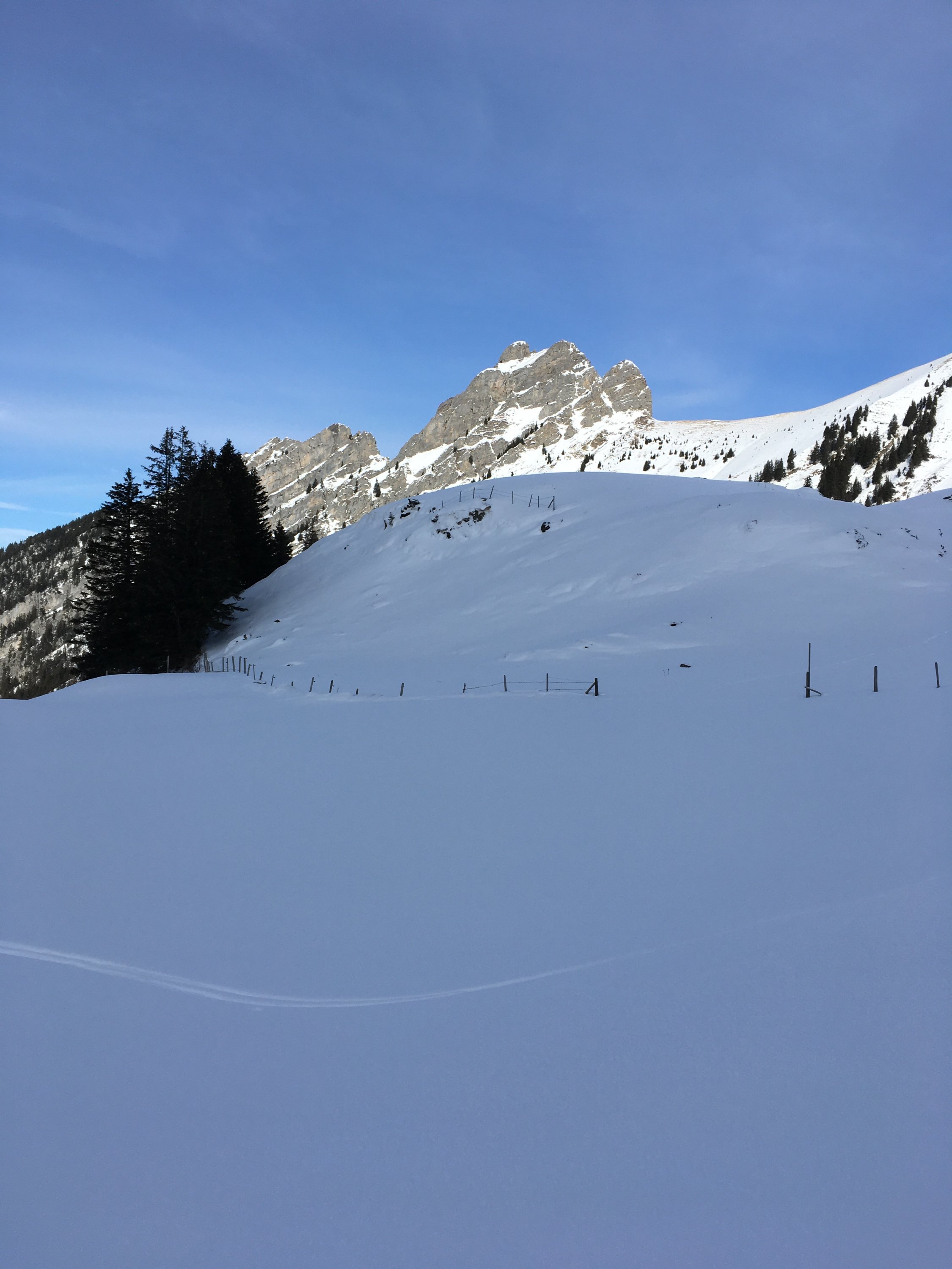 Die Abfahrt deutlich weniger super als Fädimän dies am 4.1.2021 beschrieben hat (danke für den Eintrag und den Tipp!): deutlich mehr verfahren, aber vor allem auch windbearbeitet. Trotzdem gibt es immer wieder Passagen in schönem Pulver von oben bis unten. Nur ganz unten fehlt die Unterlage, so dass manchmal Gras, Steine oder Maulwurfhügel am Skibelag kratzen.