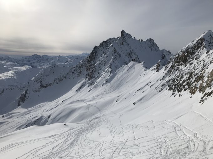 Obwohl stark verfahren hat man oben genug Platz an der Seite und findet Pulverschnee. Lohnend.
