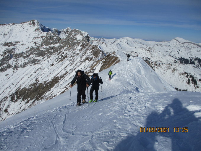 Wie es meist so ist bei Gefahrenstufe 1: nahezu jeder Hangquadratmeter war eingefahren, von daher im Abstieg gelegentlich etwas holprig. Skifahrer hatten heute in der Waldzone vermehrt mit Steinkontakt zu rechnen. Mit Schneeschuhen war das allerdings irrelevant. Der Gipfelgrat war gespurt und ließ sich mit Schneeschuhen problemlos begehen.