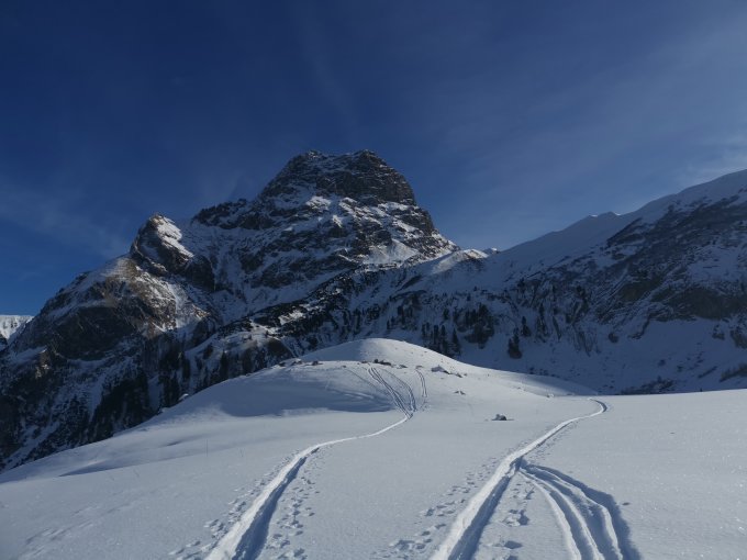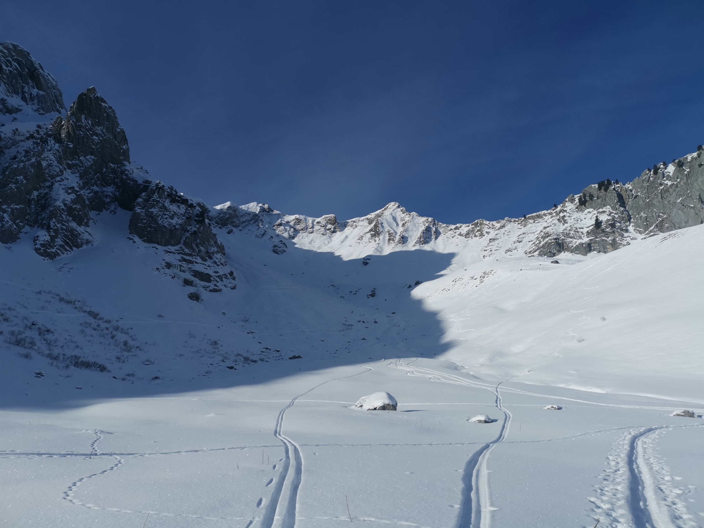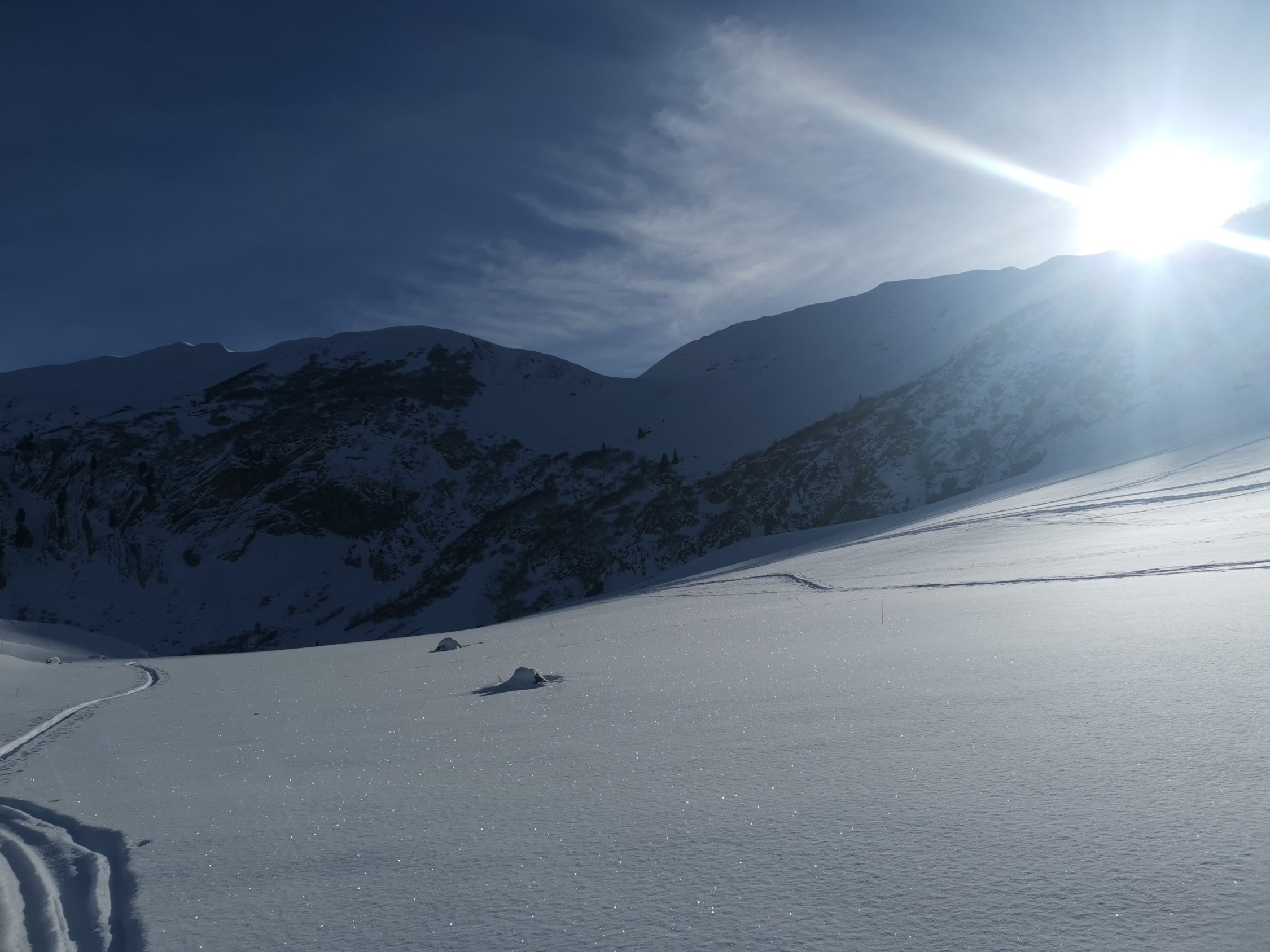 Zuerst knapp unter den Älpelekopf und 2 mal unter den Heiterberg gestiegen. Teilweise noch gute Bahnen für die Abfahrt. Einige Male Feindkontakt trotz ca. 50cm im Kar. Die mittelgroßen Steine sind dann halt das Problem.