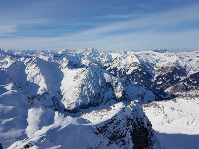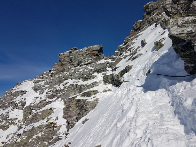 Schnee knapp, geht aber gut. Aufstieg ab Skidepot problemlos, Seile frei bis auf den Gipfel, ohne Pickel, Steigeisen gut möglich. Abfahrt Pulver mit Voraussicht ohne Steinkontakt.