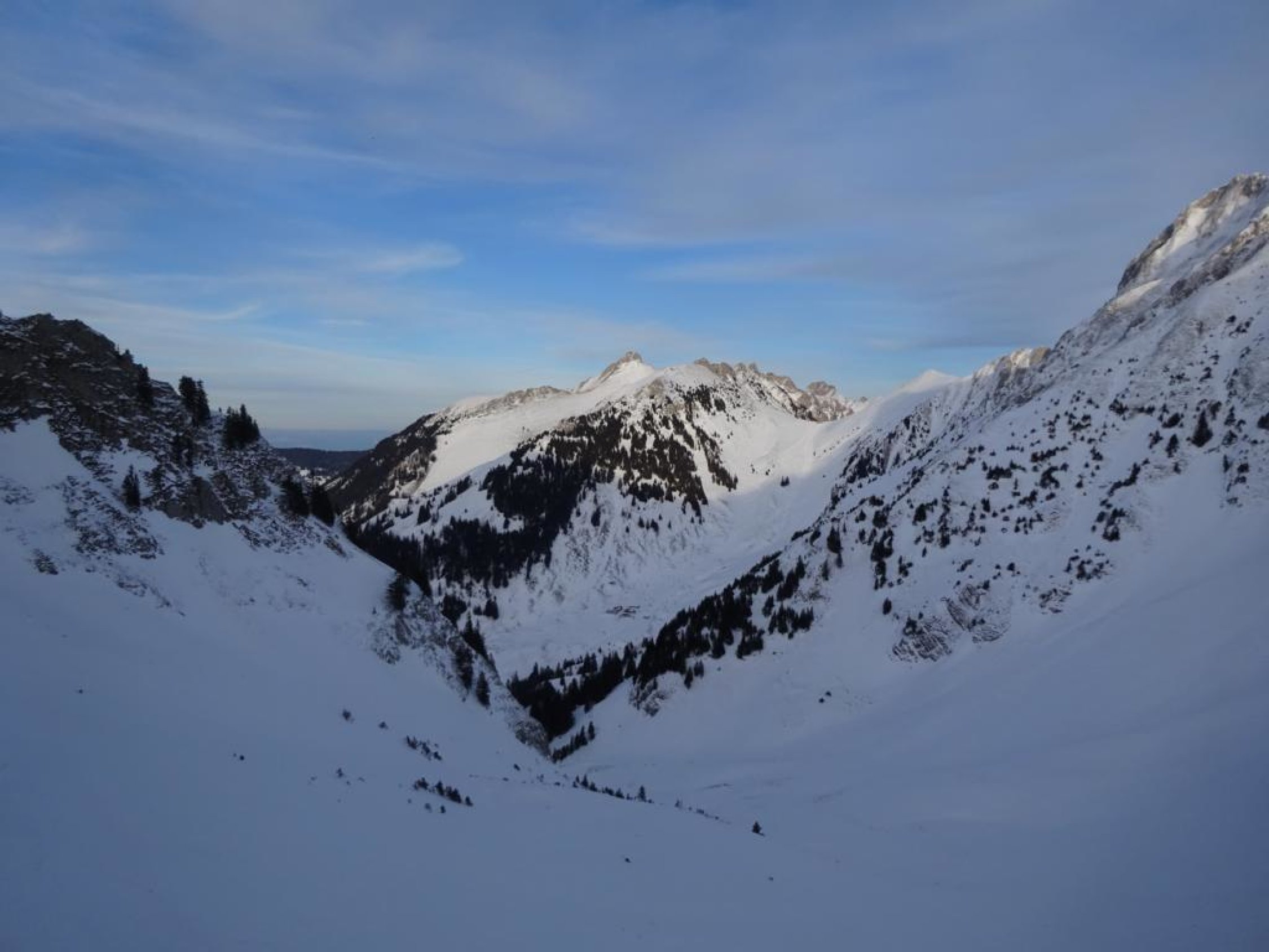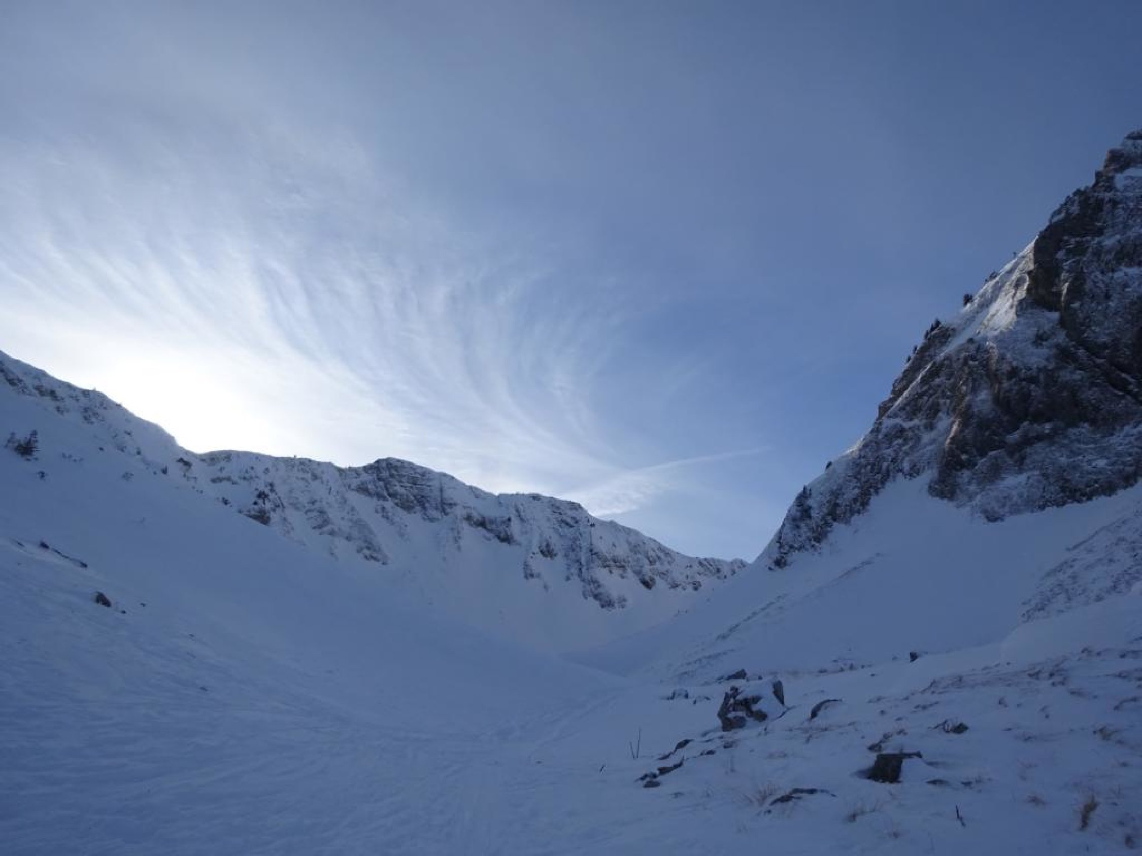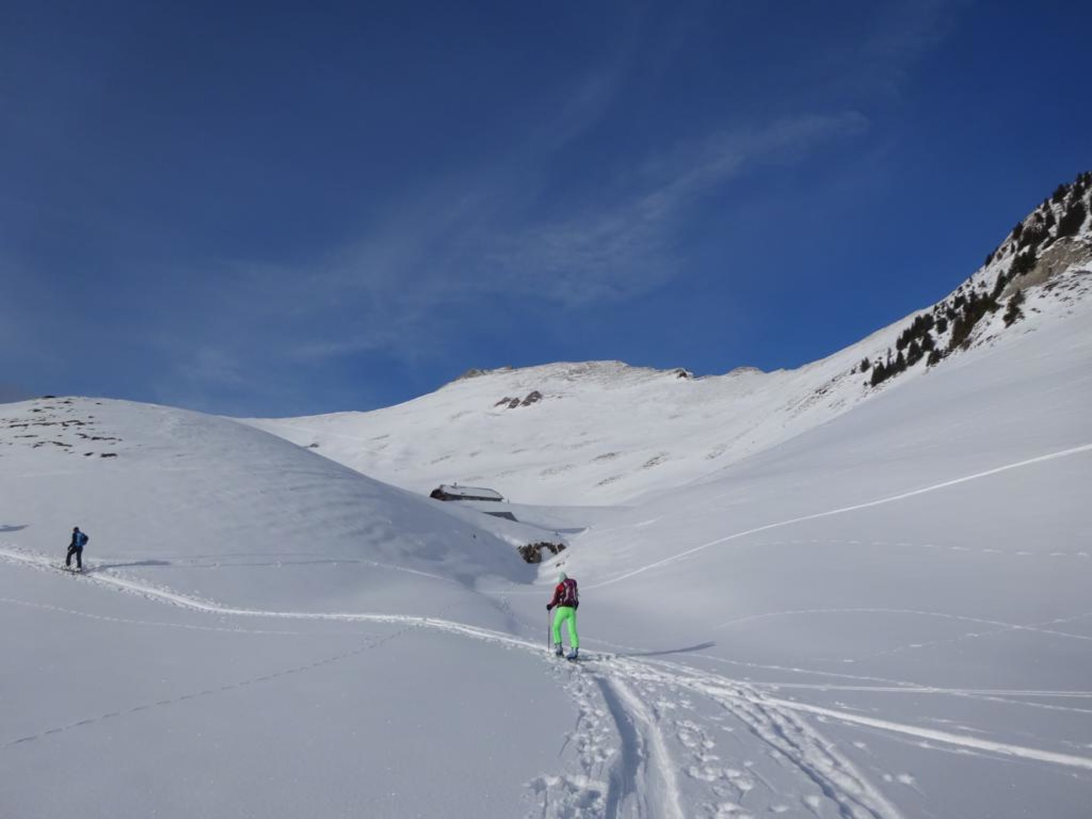 Abfahrt Südwesthang Schibe ausgezeichnet! Abfahrt Ost-Couloir Märe etwas ruppig, weiter unten gut, aber ein paar versteckte Steine, wo es abflacht wieder ausgezeichnet. Insgesamt gut.