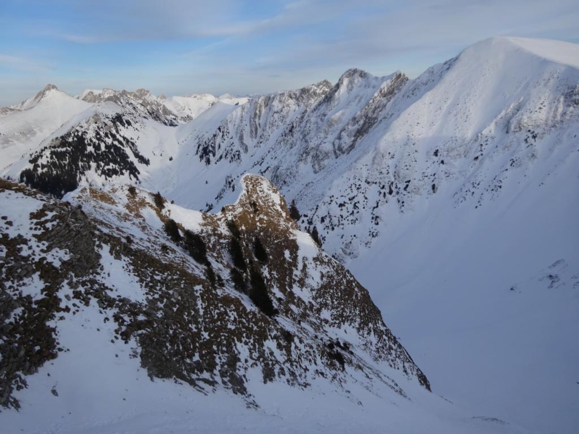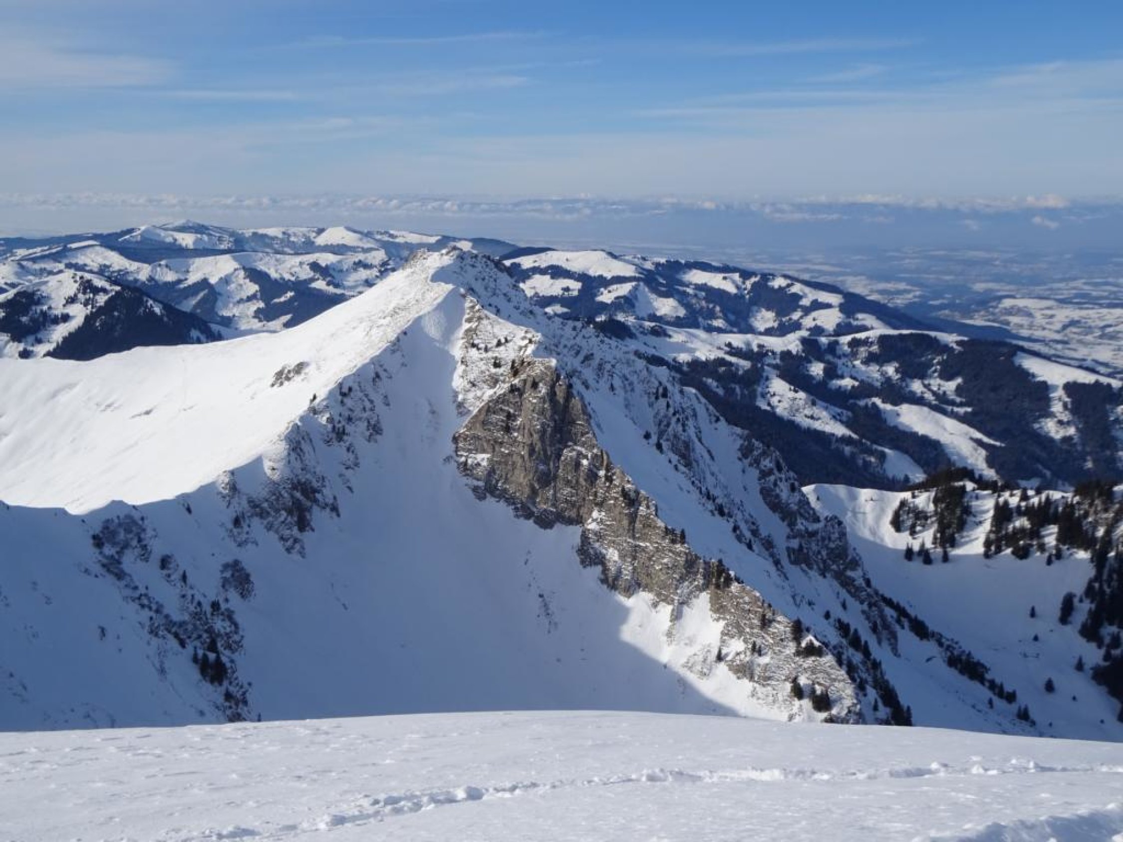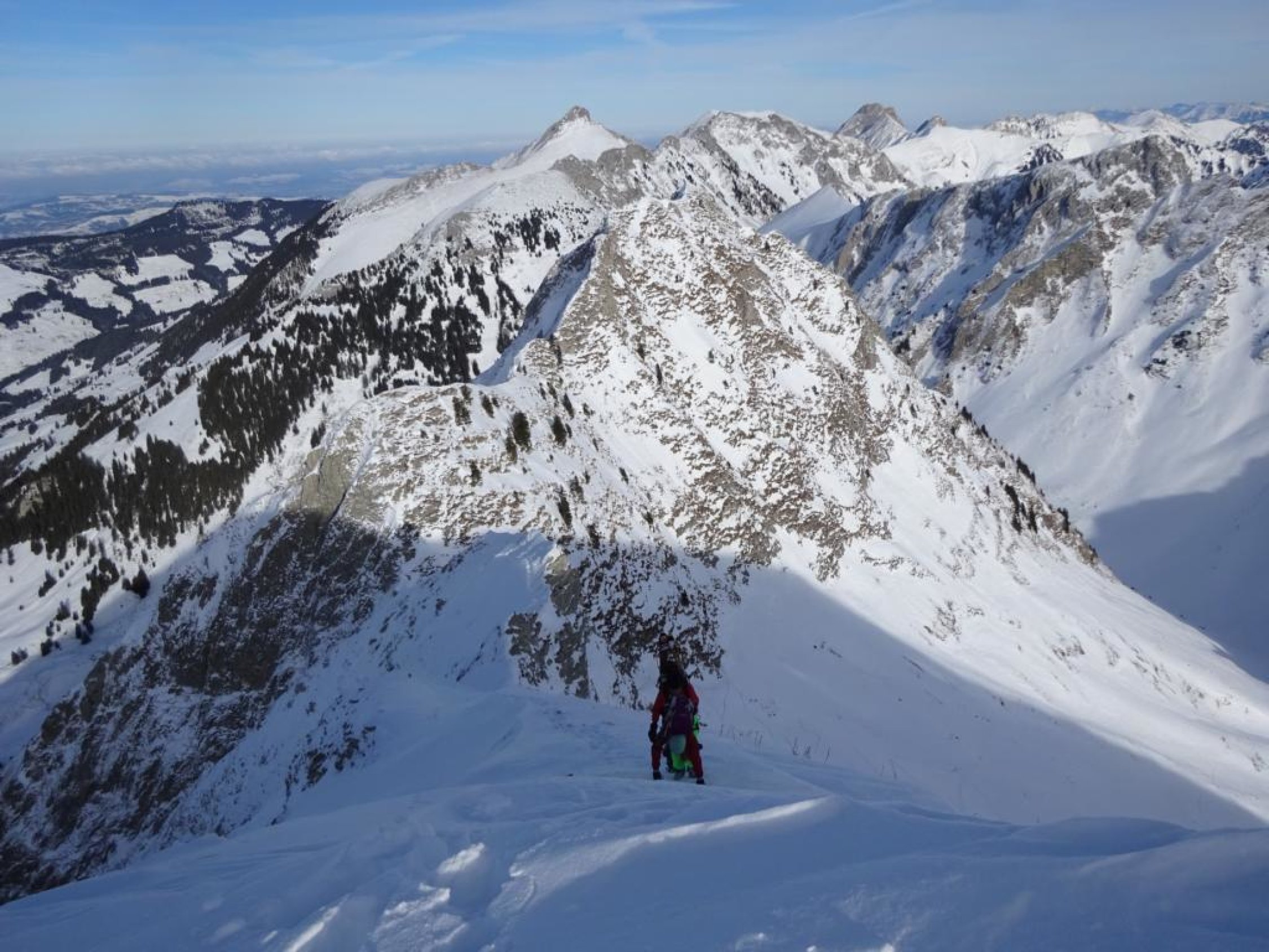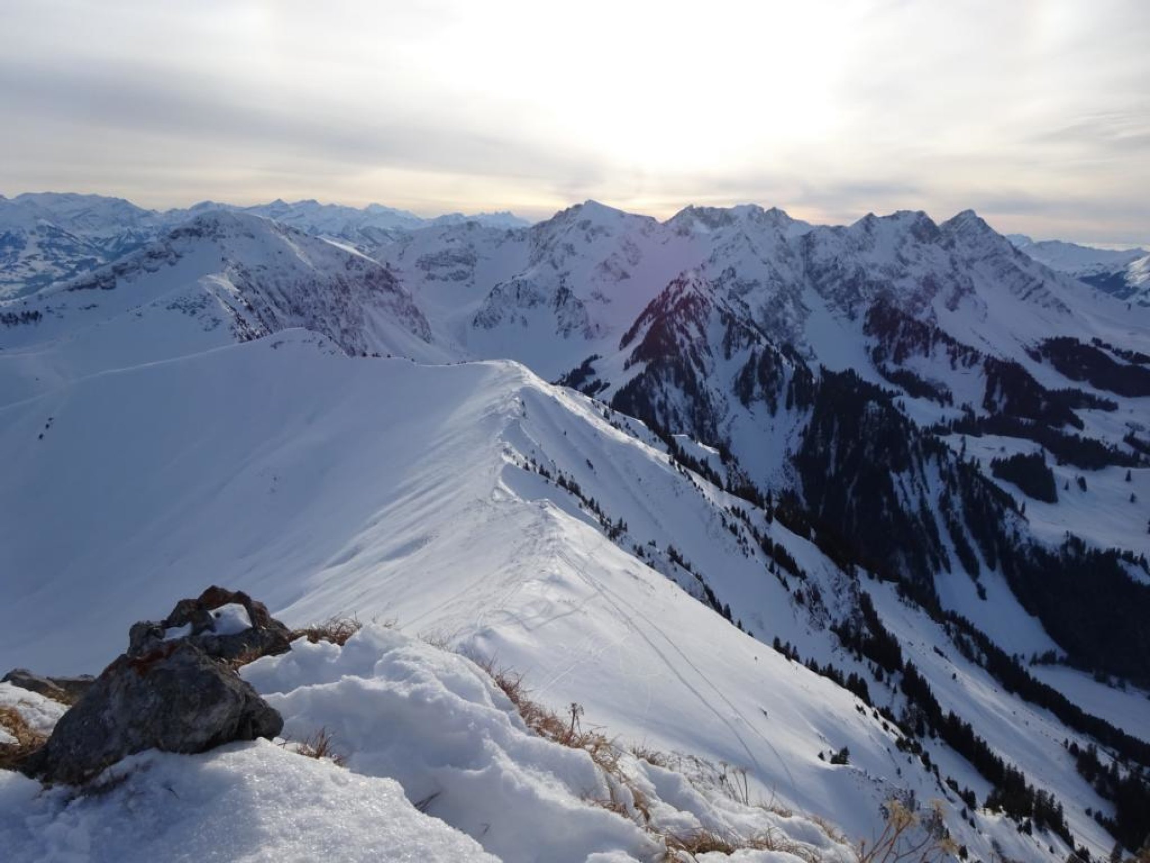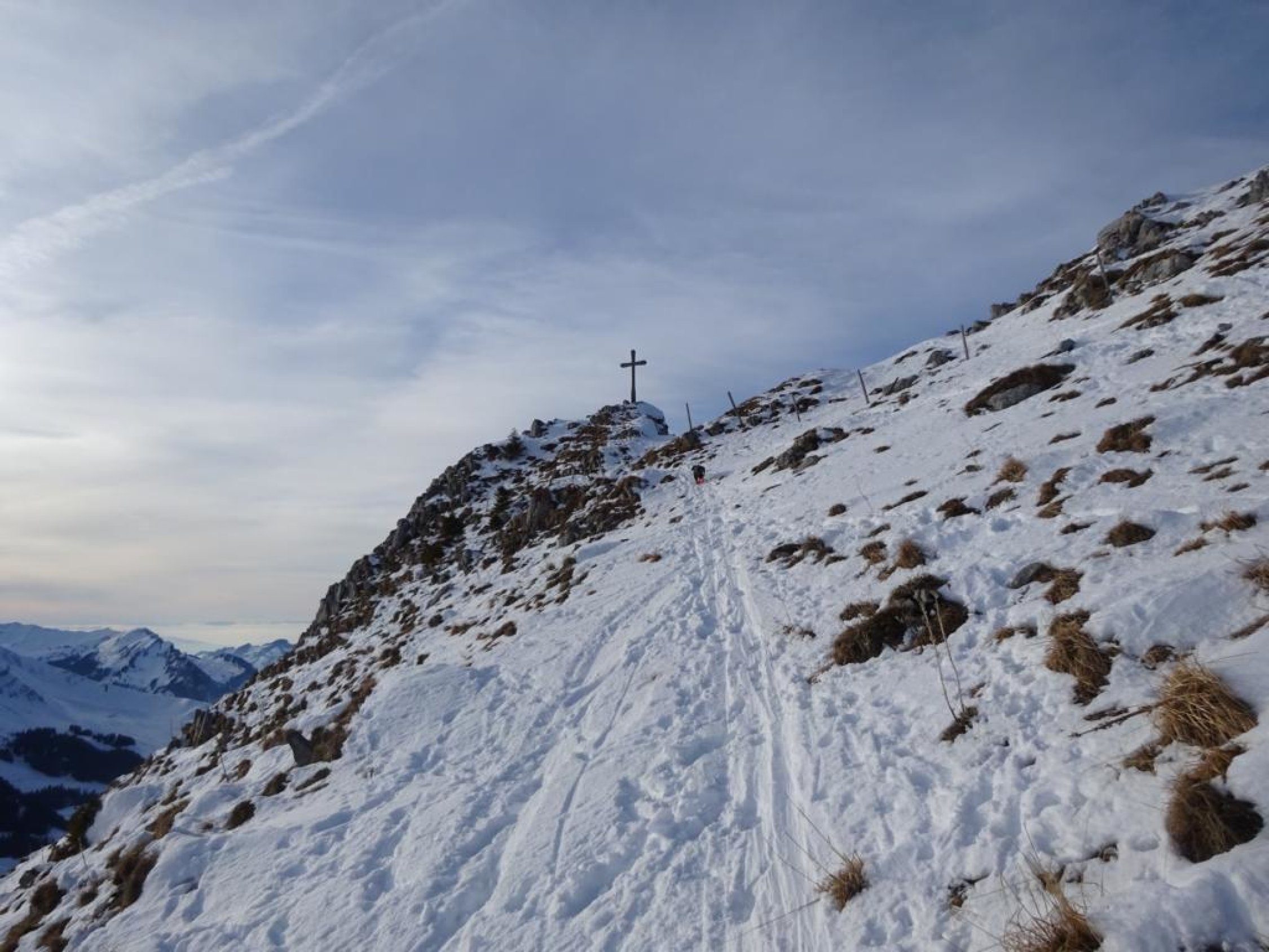 Der Grat ist ca. T4+ und verlangt bei Schnee zwingend Steigeisen und Pickel. Relativ guter Trittschnee, aber mit viel lockerem Neuschnee darüber, was es etwas schwieriger einzuschätzen und heikler machte. Ab dem Sattel zwischen Galiteflue und Schibe erst dem Grat folgen. Es kommt eine heikle plattige Stelle ohne vernünftige Griffe, bei der man rechts in den Steilhang raustraversieren kann. Danach wieder auf den Grat. Die nachfolgende Haifischflosse ist nicht traversierbar, da extrem schmal, man muss sie rechts unterhalb im Steilhang umgehen. Dahinter durch ein schmales steiles Couloir aufsteigen, danach wird das Gelände wieder gutmütiger. Kurz darauf flacht der Hang ab und man erreicht den Gipfel.