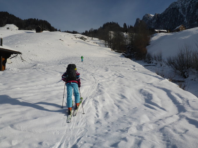 Bei der Abfahrt war es oben noch lockerer teils windgepresster Schnee jedoch spürte man teilweise die "Chuewägli". Ab Alp Schwarzenegg fuhren wir Südwestlich über das Feld nach Fällätschen. Über das Feld war der Schnee gut jedoch auch sehr knapp. Der Waldweg ist fahrbar jedoch darf einem das Material nicht reuen, ansonsten braucht es eine sehr vorsichtige Fahrweise. Ab Fällätschen hatte es eine Kruste, meine Kinder gleiteten knapp darüber ich brach jedoch durch.
