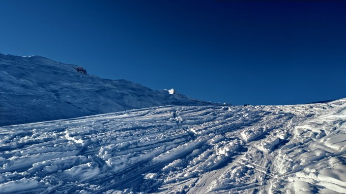 Abfahrt: Pulver von oben bis unten. Nordostseite des Gipfels war heute gut befahrbar, zwar verfahren aber mindestens 40cm lockerer Schnee. Außer in der Gipfelwand sowie unterhalb des Höhenbiels habe ich praktisch durchgängig noch unberührten Schnee vorgefunden, auch wenn ich dann zwei Mal etwas länger stöckeln/aufsteigen musste.