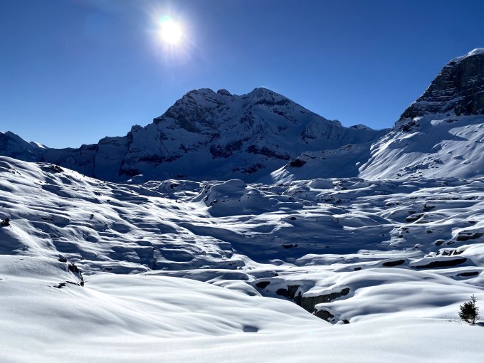 Didn't see any other tourers today after leaving Gumen - start from Gumen at 10:20, track already made until Butzi, then following an older track from Charetalp until the turn south towards Euloch. From there made the track ourselves, wayfinding towards Euloch a little difficult but we didn't waste too much time/elevation. Crossed old avalanche debris (tongue lying at ca. 2100m) which let go from a crown on the south side of Furggele, so we stayed to the north side. Good snow there, not even wind slabs - we climbed up all the way to the Hoch Turm wall east wall directly underneath the ridge and decided not to climb over the cornices. Absolutely perfect snow for the descent to Euloch, grueling climb back to Butzi, and then a bit heavier snow & a bit of stone contact down to Ortstockhaus. Long (unintentional) detour on the descent for some sightseeing through Schwettiberg.