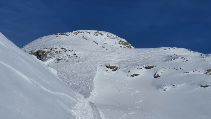 Schöner Pulver, sogar an Südhängen. Kälte sei Dank. Aber es hat sehr wenig Schnee. Man muss überall auf Steine achten.