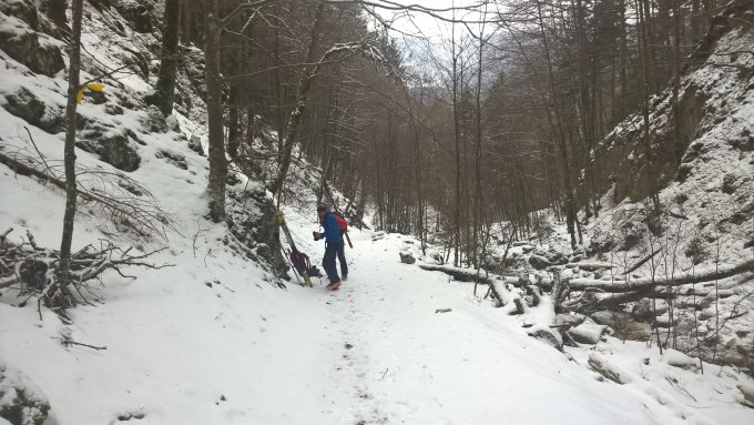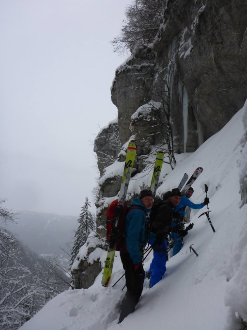 Ca. 20cm Neuschnee in der Schlucht auf bereits harter Unterlage. Die ersten paar hundert Meter zu wenig Schnee um ab dem Parkplatz mit den Ski zu gehen. Oben starker Wind und Nebel. Trotzdem eine sehr schöne Variante auf den Chasseral