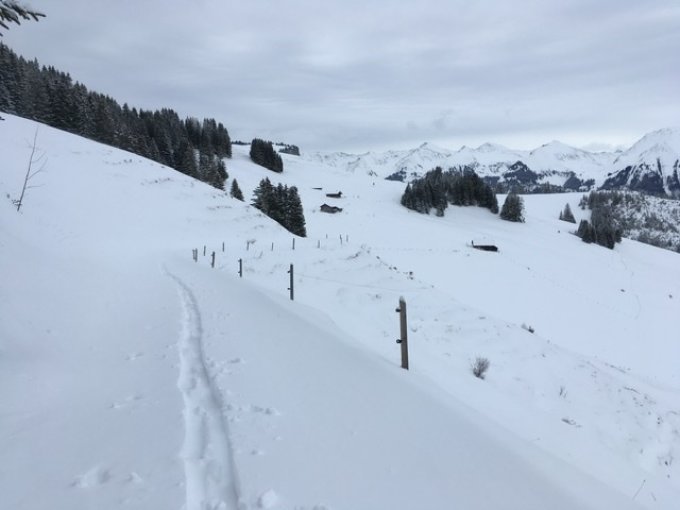 Gut bezieht sich auf die durchgehende Schneedecke. Unten schwerer Neuschnee, oben stark windbearbeitet. Der ganze Schnee wurde verfrachtet. Spuren und abfahren waren entsprechend anstrengend.