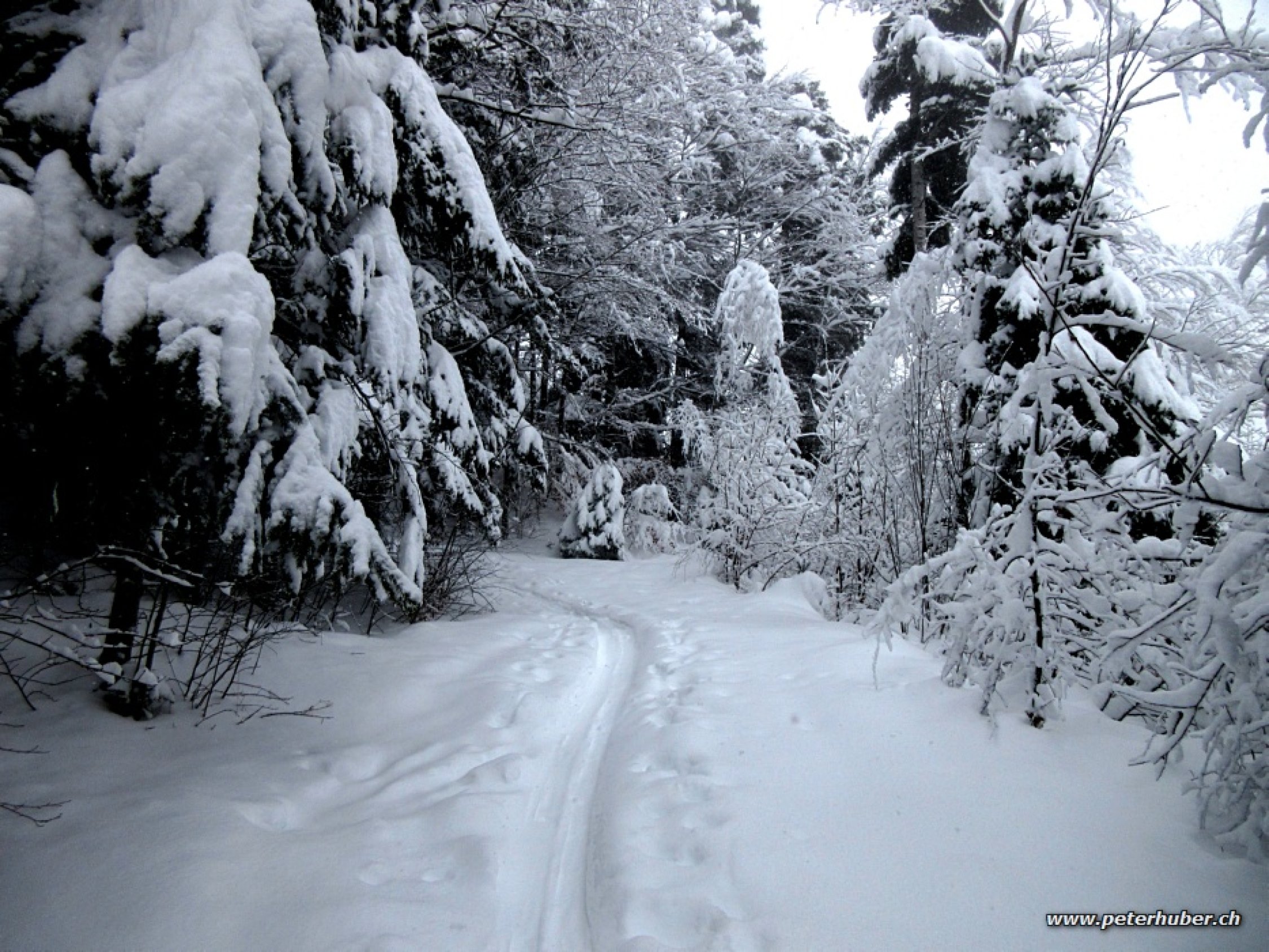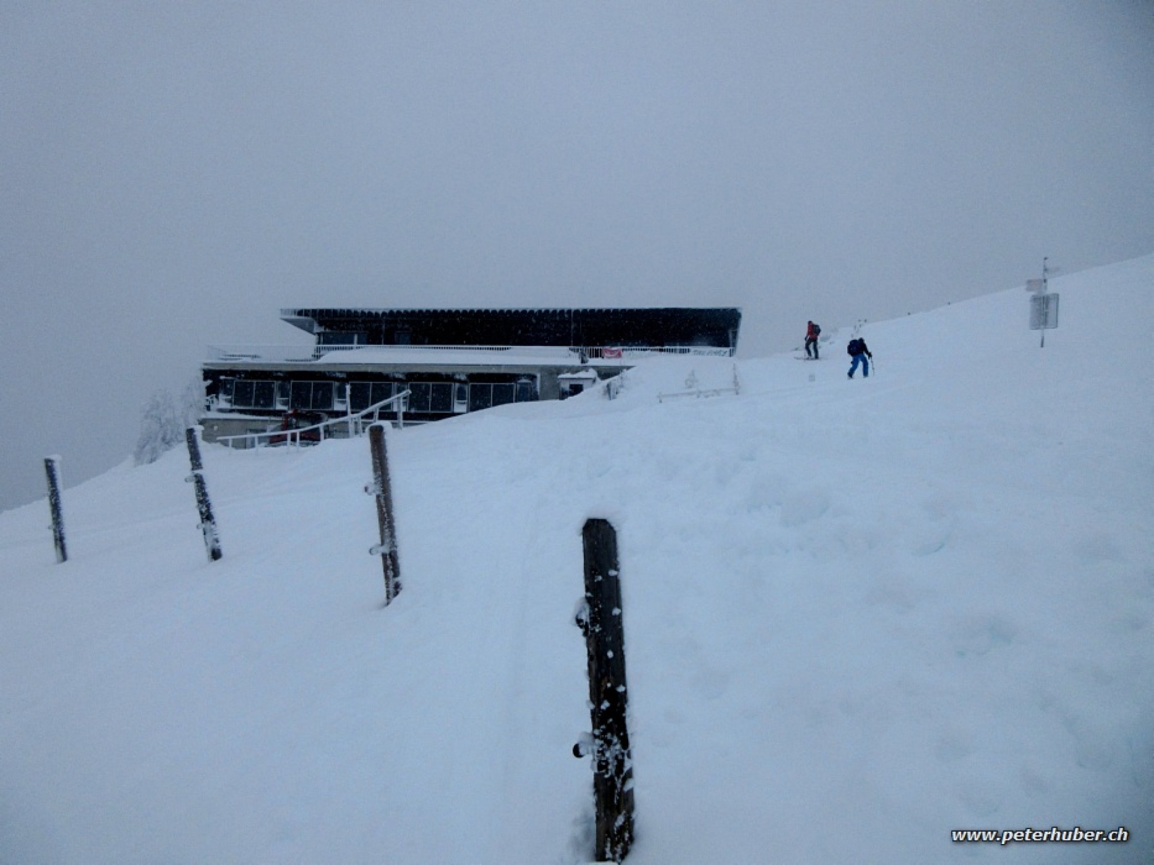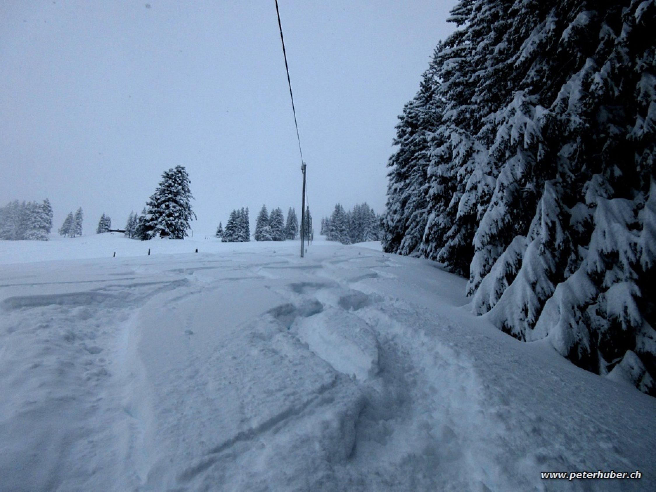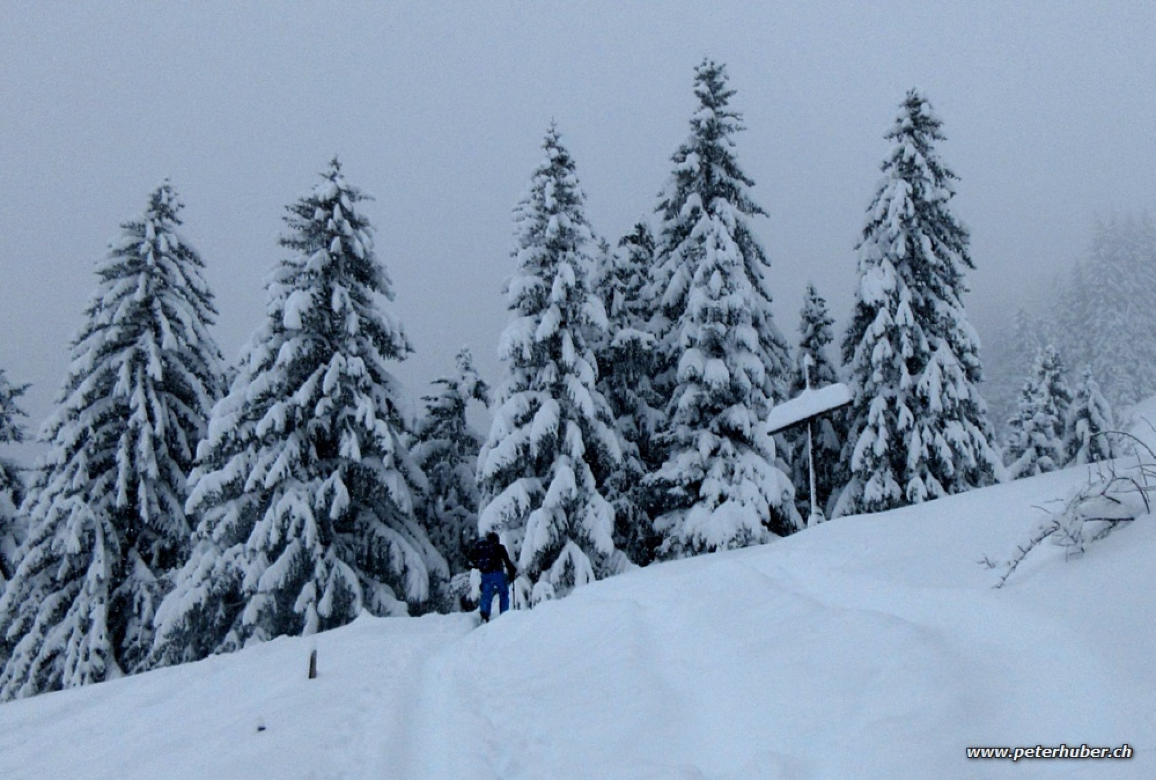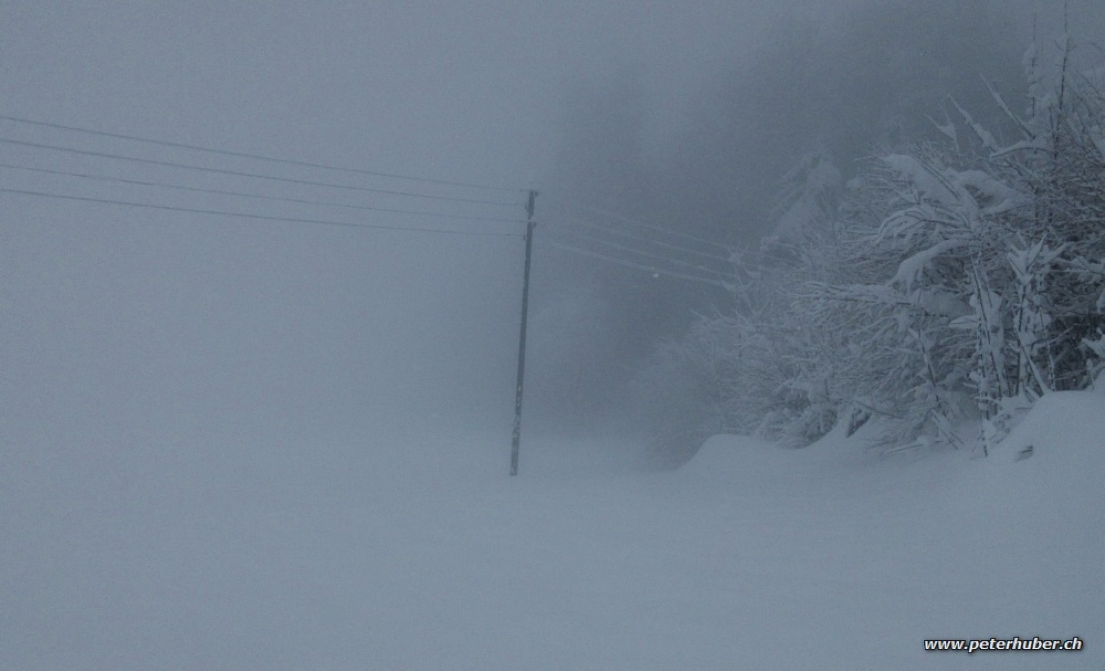 Schneefall, recht warm, nur knapp unter 0°C. Meist Nebel. Es hat ca. 40 cm Neuschnee. Besten Dank für die frühen Spurern.