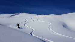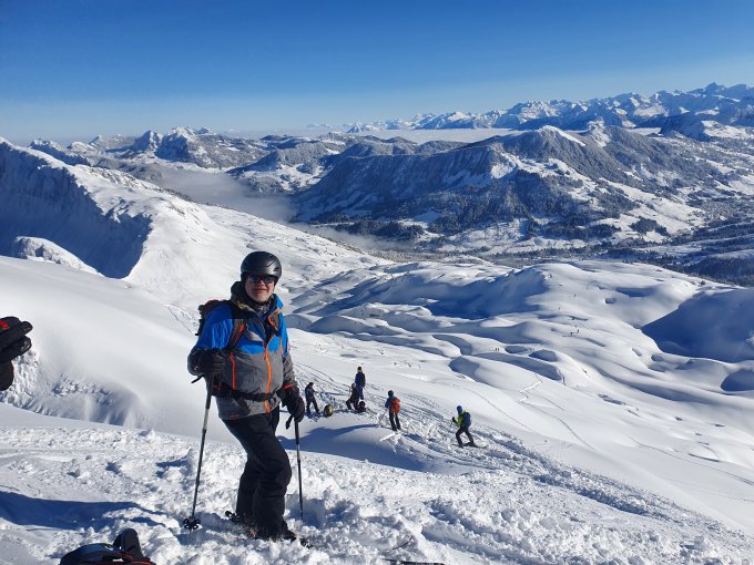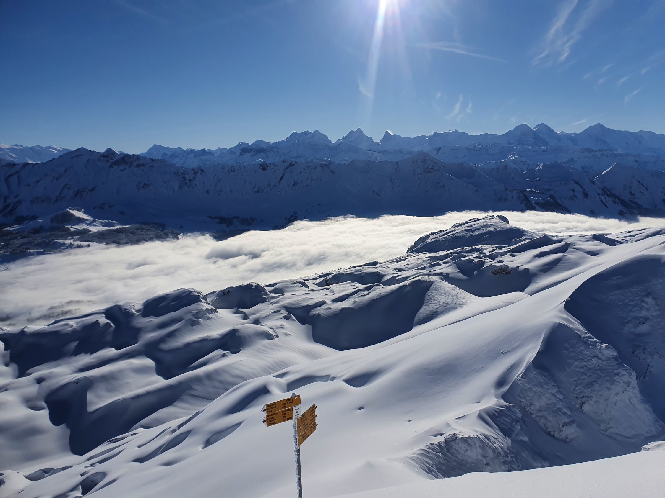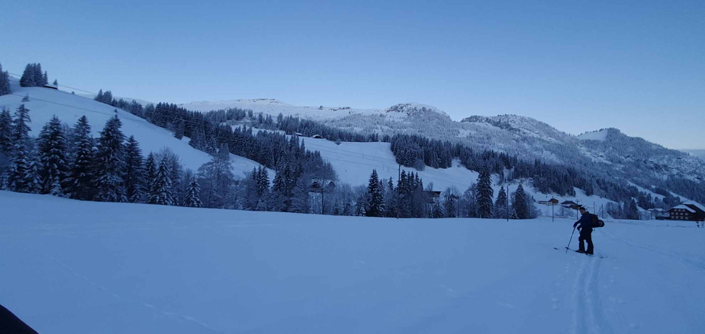 Ein super Tag hat sich schon am Morgen abgezeichnet. Zwar sehr kalt im Bereich von -9°C bei Start. Ganzer Aufstieg Spur im Pulverschnee. Gute Spur gelegt, durch den Wald und im oberen Teil etwas ungewohnt - oben weit Richtung West und im Gipfelhang direkt hoch. Beste Verhältnisse angetroffen. Heute sogar mit Skis bis auf den Gipfel.Die Schrattenfluh ist wieder gut eingeschneit. Abfahrt heute Route über Silwängen gewählt, alles Top erwischt. Oberhalb des Waldes hat es teilweise abgeblasene Stellen, bei denen Steinkontakt noch möglich ist. Sonst kein Problem damit.