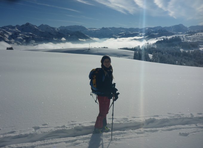 Wunderschöner Pulver auf der ganzen Route. Abfahrt nicht wie in der Tour angegeben nach Reidenbach, sondern auf ca. 1900m in direkter Linie zum Jaunpass zurück.