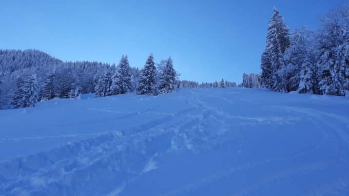 Tief verschneiter Aufstieg, der erste an dem Tag musste garantiert ziemlich ackern, um die Spur angelegt zu bekommen. Vom Parkplatz beim Geissboden weg über den Dürrenbach, dann an der westlichen Kante aufwärts nach Stofel und dem Gehweg entlang bis Büttel. Hier drehten alle um und verzichteten auf den steilen Waldabschnitt bis zum eigentlichen Gipfel.