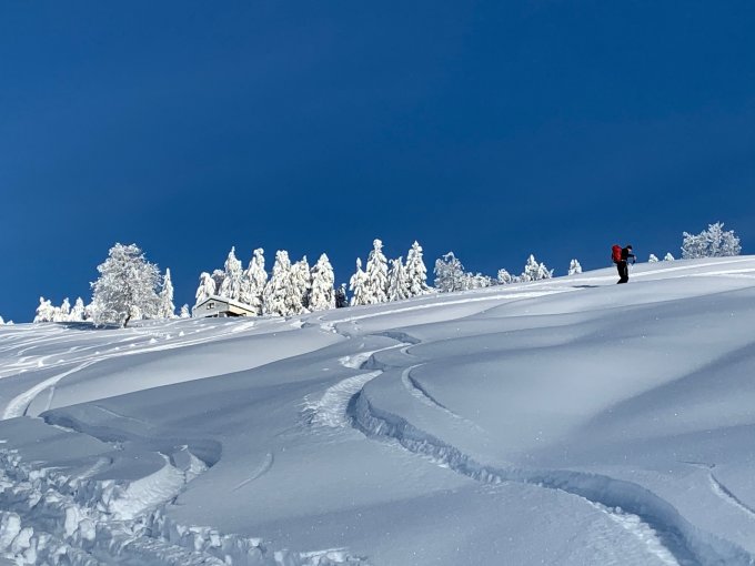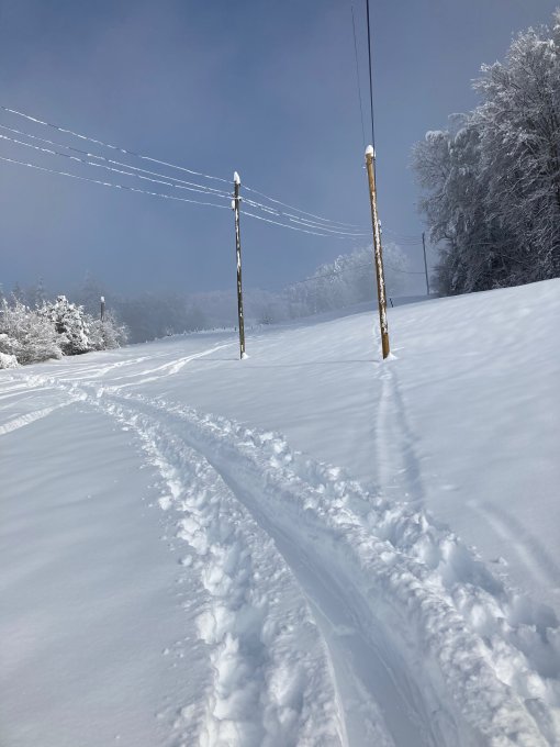 Eine Tour mit Seltenheitswert. Nach dem grossen Schneefall ist die Route vergleichsweise sicher und trotzdem steil genug für etwas Fahrspass. Als Spätstarter konnten wir keine Ansprüche auf unverspurte Hänge hegen, dafür profitierten wir von einer guten Spur und das war heute viel Wert. Unten lagen vielleicht 40cm Schnee, der gegen den Gipfel deutlich zunahm und lockerer, pulvriger war. Im Aufstieg wurden wir immer wieder von Nebel eingehüllt oder von der Sonne gewärmt, ein steter Wechsel. Auf dem Gipfel waren wir dann einige Zeit ganz im Nebel und entschieden uns zur Abfahrt bevor er noch dicker werden konnte. 200hm runter waren wir wieder in der Sonne und genossen einen tollen Blick in die Lindtebene. Es liegt so viel Pulver, dass man seine Spur gut ins Gelände einplanen muss sonst wird die Abfahrt doch einigermassen anstrengend, weil man zum nächsten Abhang schieben muss. Der Schnee war oben super spassig gegen unten wurde er durch die Sonneneinstrahlung schon etwas schwer.
