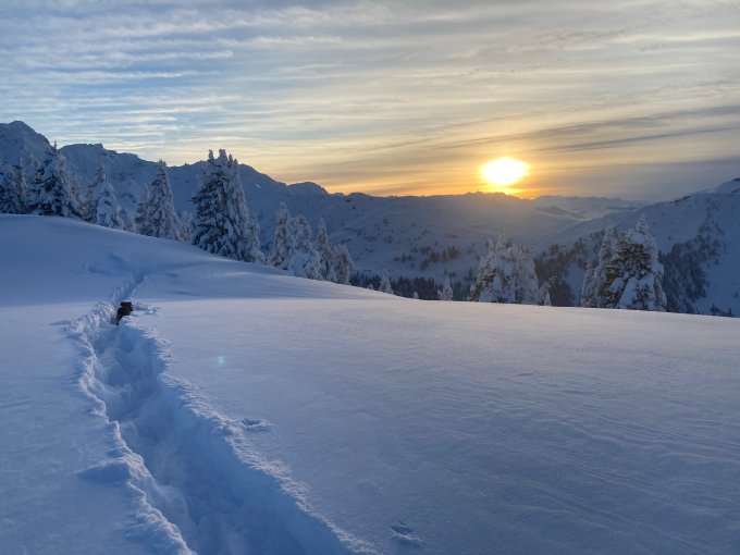 Start um 15.00 ab Hinterberg, erfreulicherweise musste ich daher heute mal nicht Spuren. Temperatur beim Start -12°C. Im Wald und auch drüber gemischte Ski- und Schneeschuhspuren. Die deutlichste davon führte mich auf den Grat in der Mitte zwischen Fadeuer und Wannenspitz, P. 1985m. Da der Nordhang des Fadeuer speziell als lawinengefährdet charakterisiert wird, bin ich mit den Fellen zum Wannenspitz, dabei auch einen kurzen Grathang mit mehr als 30° Neigung hinab, zwischen einigen kleinen Bäumchen, ohne hier Rutsche auszulösen. Schöne Abendstimmung.