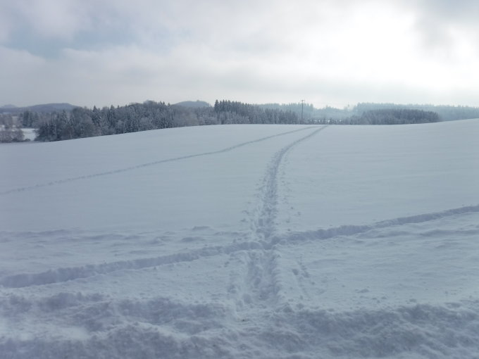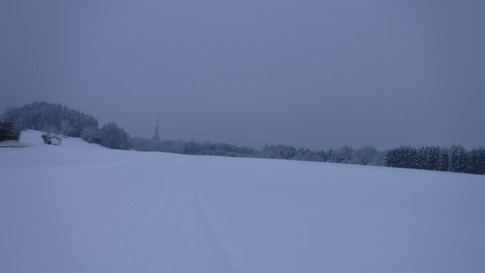 Tourenbeginn um 08:00 Uhr bei -5°C unter bedecktem Himmel und tagsüber herrschenden diffusen Lichtverhältnissen. Lediglich nach dem Mittag hellte es für 1,5 Stunden auf. Bis auf die 2 km lange Loipe „Feld“, die 5 km lange Loipe „Blauensee“ und 1 km lange Verbindungsroute „Marktanner“ waren die Routen mit dem Loipengerät präpariert worden. Die Loipen sind geeignet für Skating und Klassik-Fahrstiel. Die Blauensee-Route fuhr ich cross country durch 30 cm Pulver-Schnee, was erheblich mehr Zeit bedarf. Größtenteils konnte ich eine Schneeschuhtour von 2 Personen nutzen und eine LL-Spur von einem Einzelläufer. Am Ende begegnete ich zwischen Scheibensee und Kesenweiler 3 Leuten im Gegenverkehr.