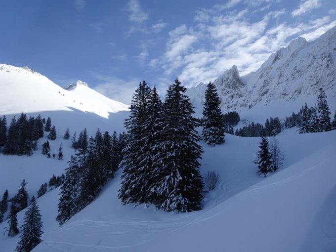 Abfahrt bis Mittelalpigle und - weil es so schön war - noch auf die Alpiglemäre. Hier schon mehr zerfahren. Auch am Ochsen war mittags dann mehr los. Unterhalb der Frilismad sind wir aber westwärts ins Tal runtergefahren, das war ausgezeichnet und hatte noch kaum Spuren.