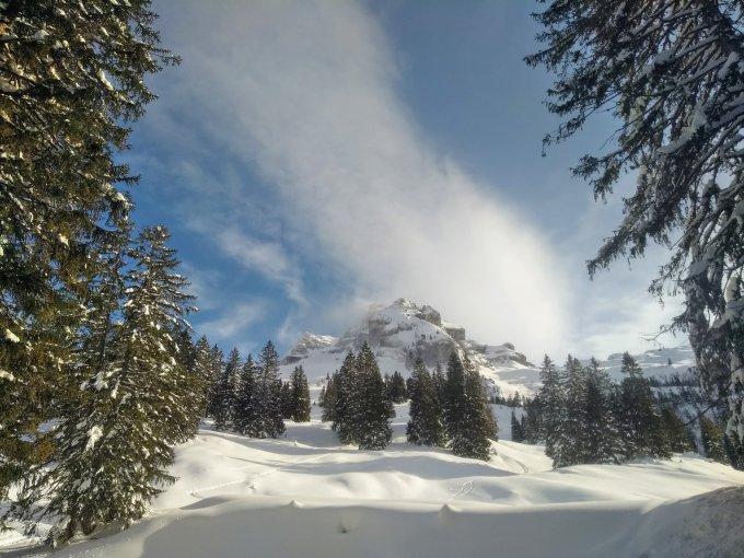 Oberhalb von 1800m sehr windig, deshalb stark verblasen, ja teils schon wieder bis auf die Grasnarbe oder eisigen Grund blankgefegt. Immerhin, da der Sturm erst heute begonnen hat, traf man in den Mulden noch auf weichen, gut fahrbaren Schnee. Unterhalb gut bis sehr gut, so genussvoll wie heute habe ich die Rinderweid auf >20 Touren noch nie erwischt.