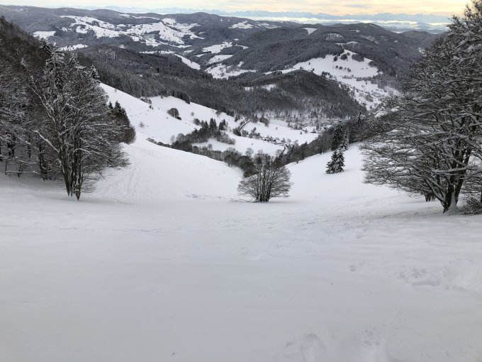 Unterhalb 1200 Meter ist alles bester Pulverschnee bis hinunter nach Schönau und Neuenweg (ca.700 Meter), aktuell kaum verspurt und traumhaft zu fahren.