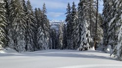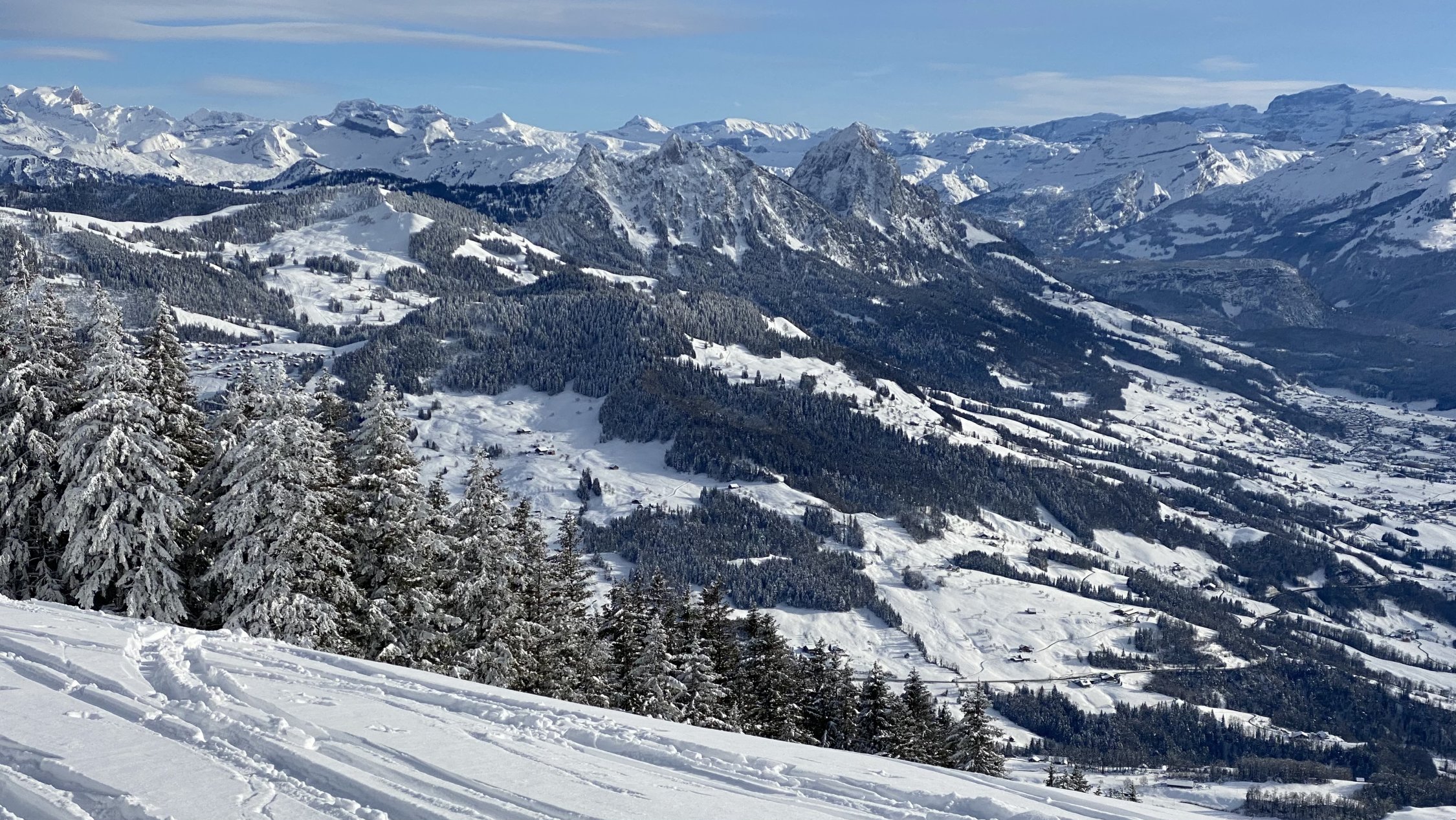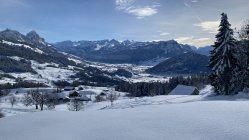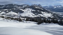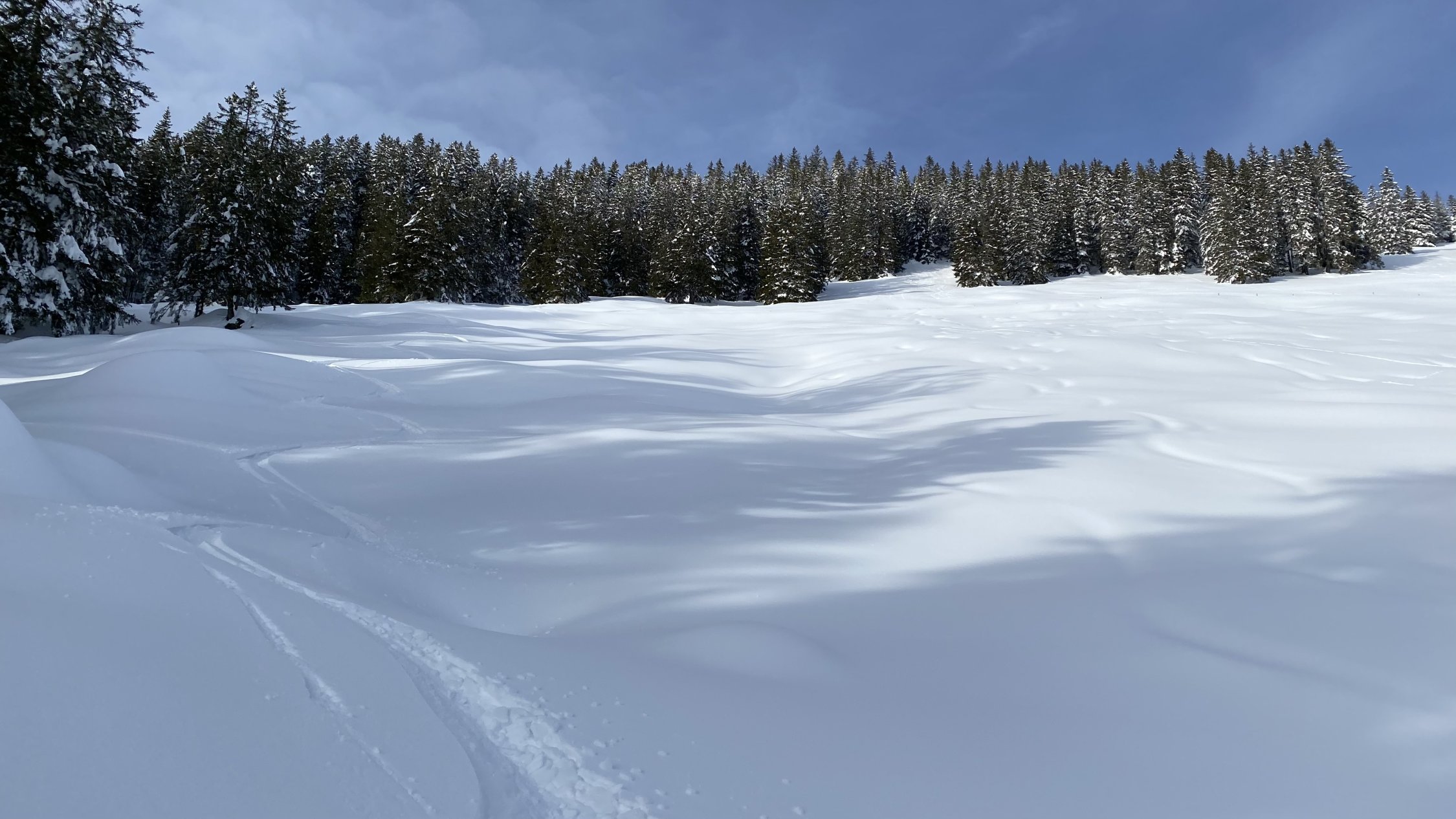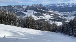 Noch erstaunlich viel Platz für eigene Spuren, auch auf der Originalroute. Ich bin allerdings von der Langmatt gerade hinunter in eine schmale Schneise, dann kurz durch den Wald und rüber in den Hang unter Schwantenring. Dann immer östlich des Schäfbodenbachs hinunter (im Schatten der Bäume, deshalb alles bester Pulver; und: first line!). Erst auf der Höhe des Hofs "Unter Überwurf" (Pt. 834) querte ich den Bach und treppelte das Bort hoch zum Hof, dann rüber auf Normalroute und runter nach Ecce Homo.