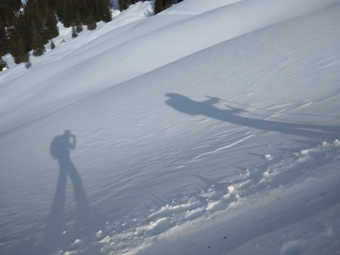 Südhänge Richtung Sigiswang verfahren und durch Wärme/ Sonne schon schwer. Durch die Sonne bildet sich auch schon ein leichter Deckel. Die nördlich ausgerichtete Hänge ins Ostertal noch schön zu fahrender Pulver