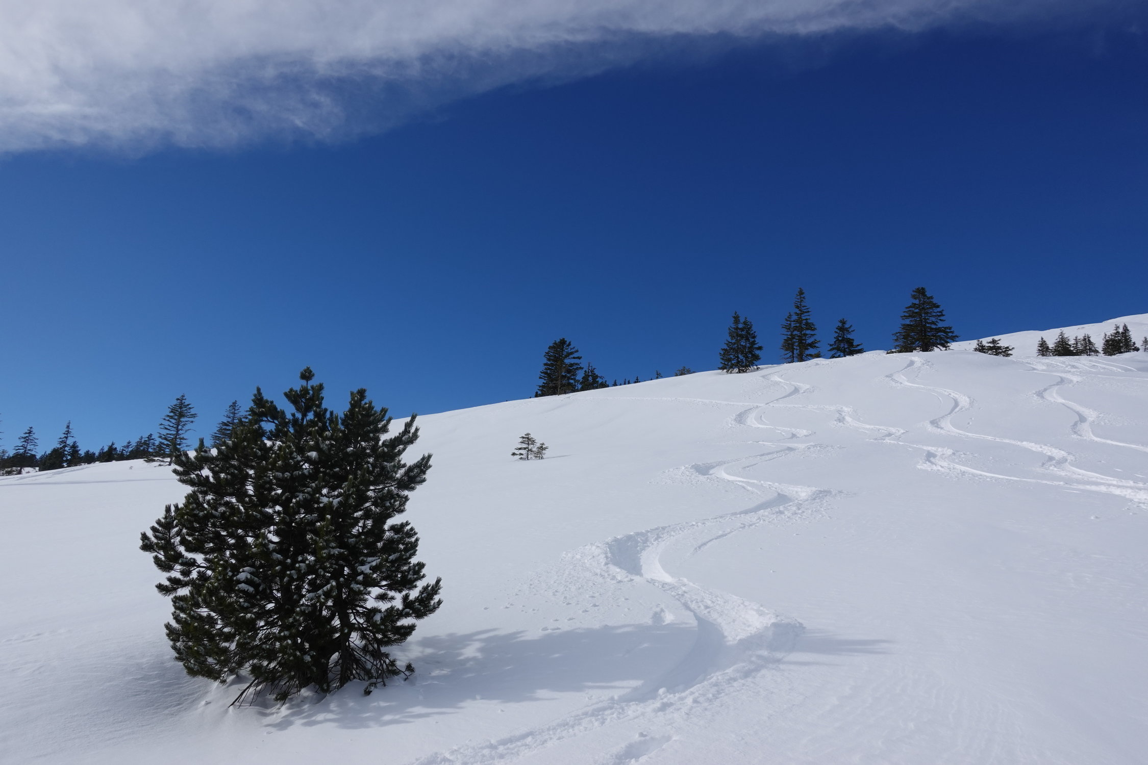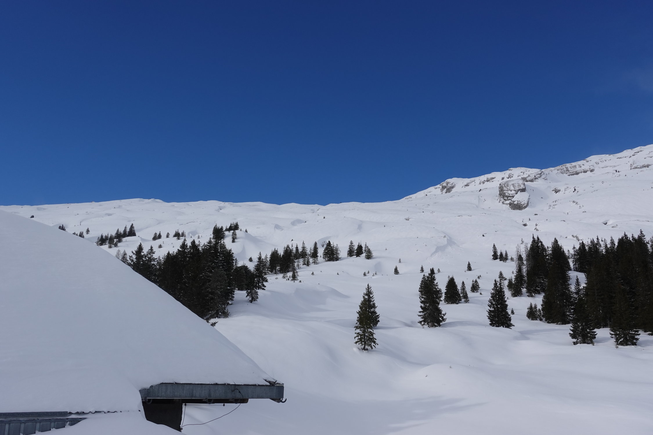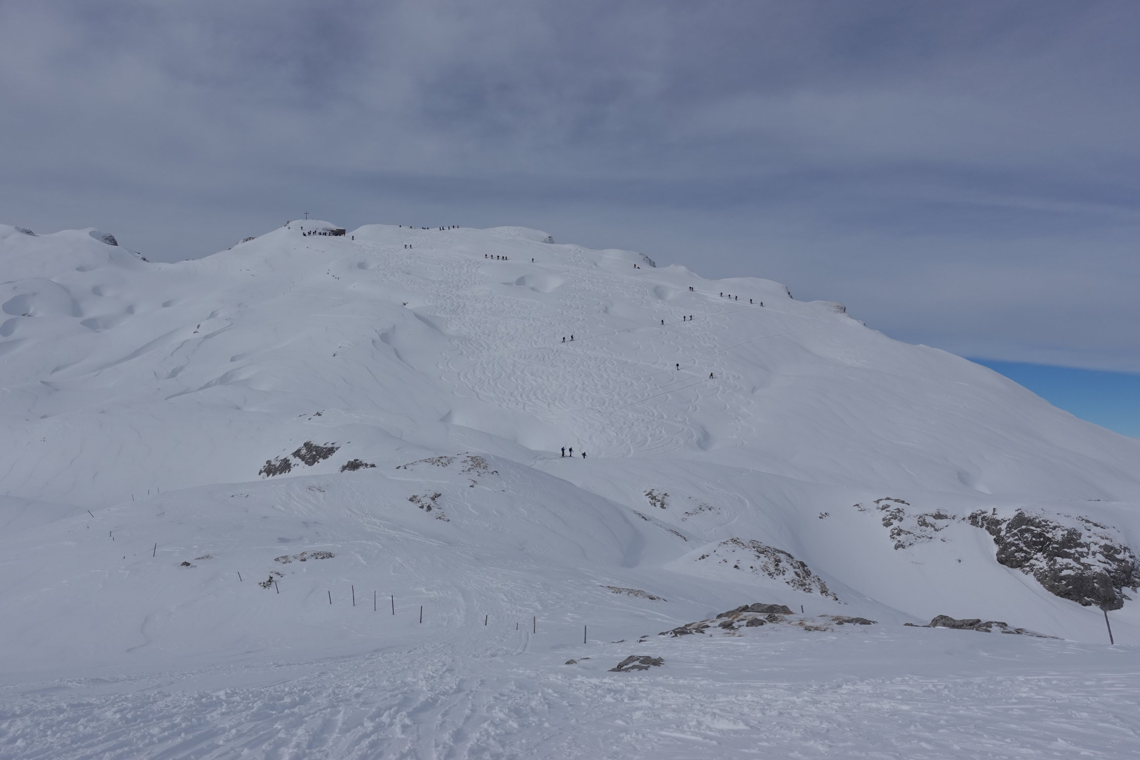 Pulver, teilweise windbearbeitet und deshalb etwas unregelmässig verteilt. Kuppen z.T. abgeblasen. Schlusshang nach Hirsegg harte und unregelmässige Unterlage unter dem Pulver ... jammern auf hohem Niveau ...