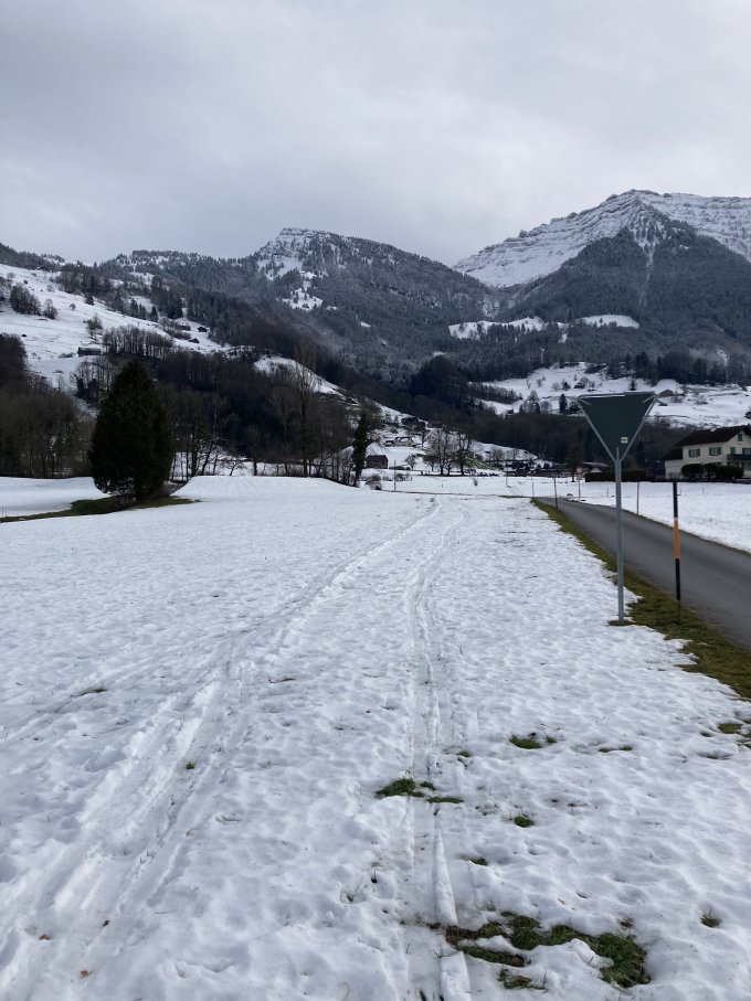 Gestartet an der Bushaltestelle „Rufi, Sonne“. Schnee reicht grad so, ein paar hundert Meter weiter östlich in Rufi ist die Linthebene grün. Vom Regen geprägte Schneedecke, um die Mittagszeit noch glasig/verkrustet. Ab ca. 640MüM leicht gezuckert, dann mit der Höhe zunehmend mehr Neuschnee, bei Underbogme wohl 20-30cm. Bis etwa 1150MüM ist die Harst-Schicht des Regens spürbar, darüber ist die Unterlage hart, ab Oberbogme windgeprägte Schneedecke.
