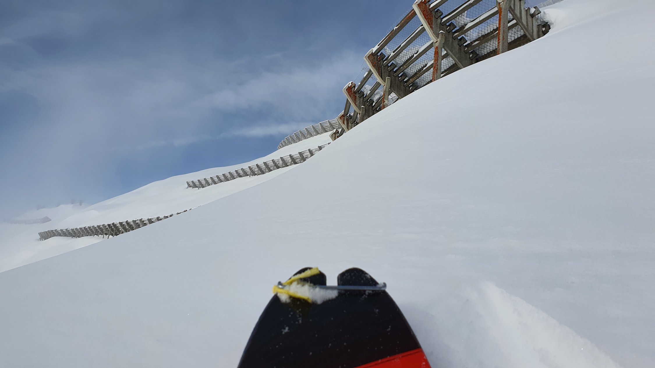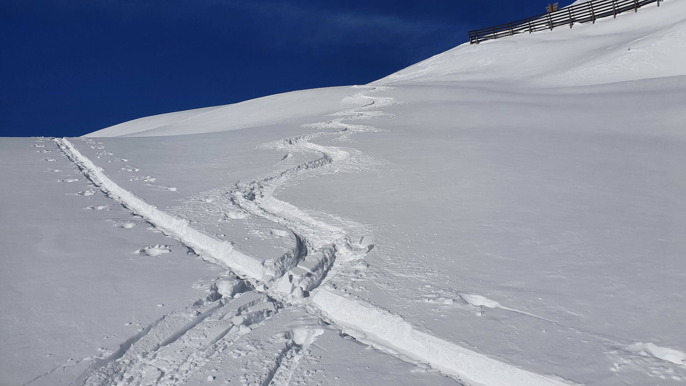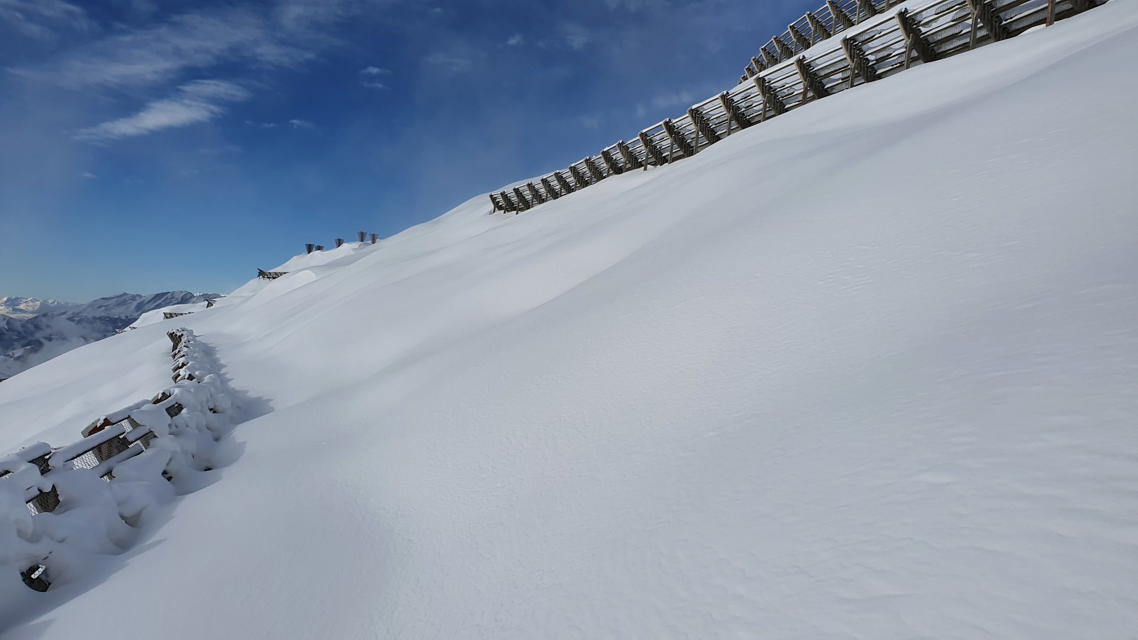 Der SW-Gipfelhang abgeblasener, hartgepresster Schnee. Auf der Abfahrt im oberen Bereich ca. 20 cm Pulverschnee, weiter unten etwas weniger Pulverschnee auf griffiger Unterlage.