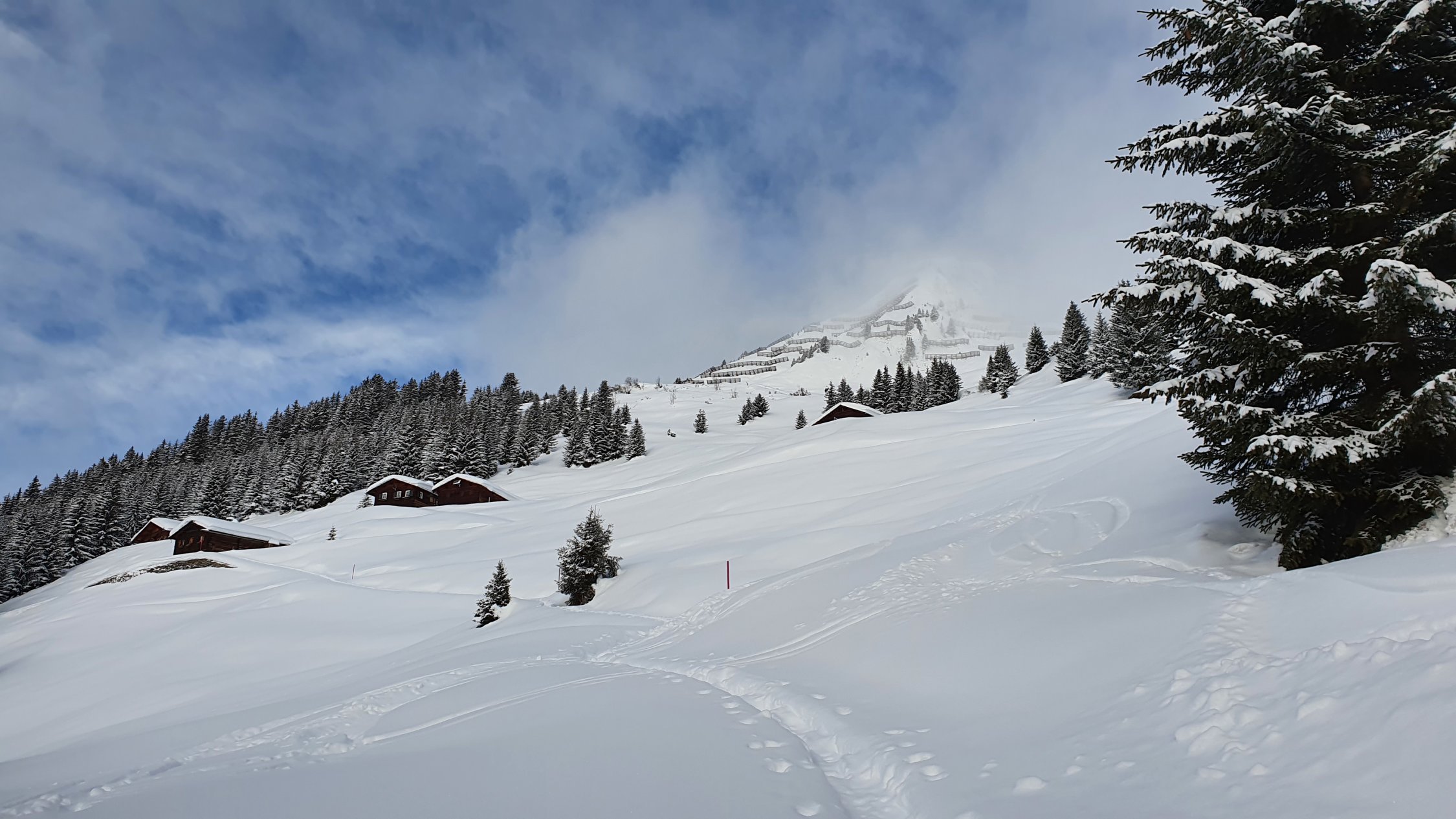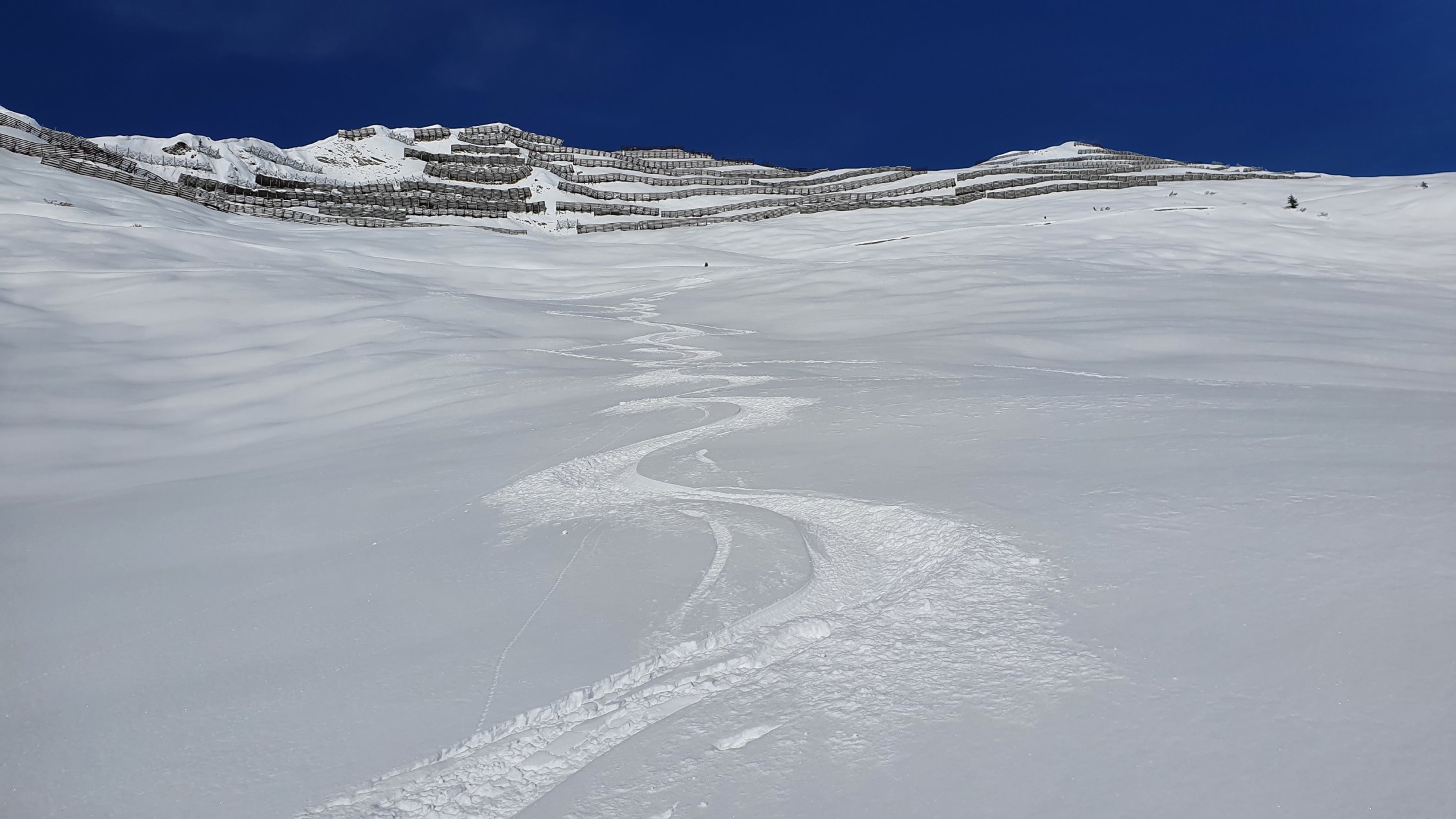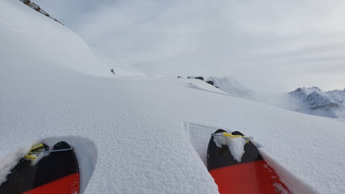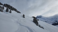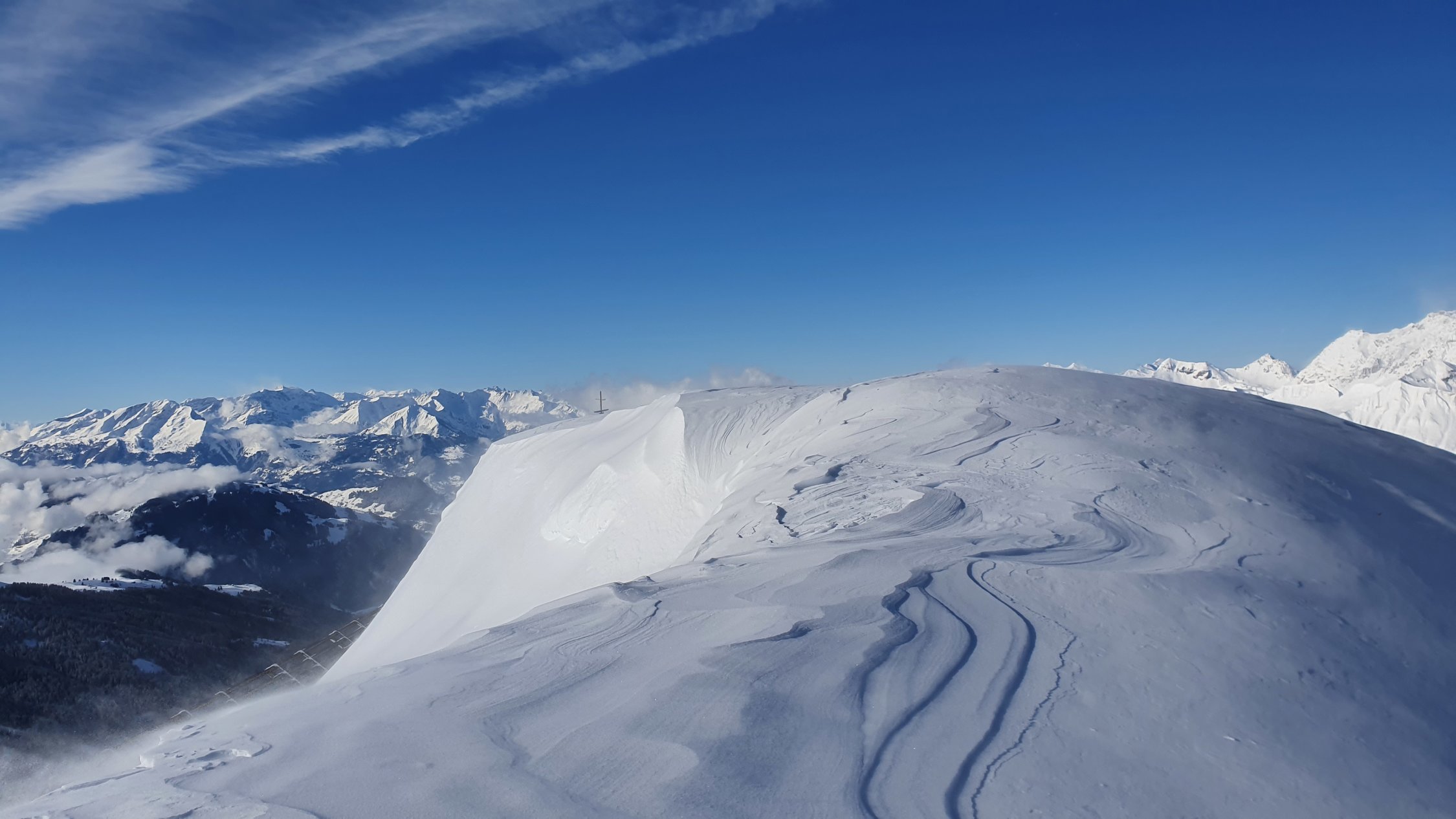 Der SW-Gipfelhang abgeblasener, hartgepresster Schnee. Auf der Abfahrt im oberen Bereich ca. 20 cm Pulverschnee, weiter unten etwas weniger Pulverschnee auf griffiger Unterlage.
