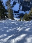 Abfahrt zunächst entlang der Aufstiegsroute bis gegen 1850, nicht schlecht, aber auch keine Sensation. Nach erneutem Aufstieg bis gegen ~2400 m stärker gegen die nördliche Begrenzung des Gipfelhanges gezogen, dort bereits einige sehr schöne Lines. Hier dann schöner Pow. Abfahrt durch das breite Waldcouloir, kurz bevor die Traverse durch den Wald ansetzt. Bis Erbs Chirel schöne Hänge durch den Wald. Dank gutem Schnee liefen die Ski auch gut durch die oft eher flachen Passagen des Chirel.
