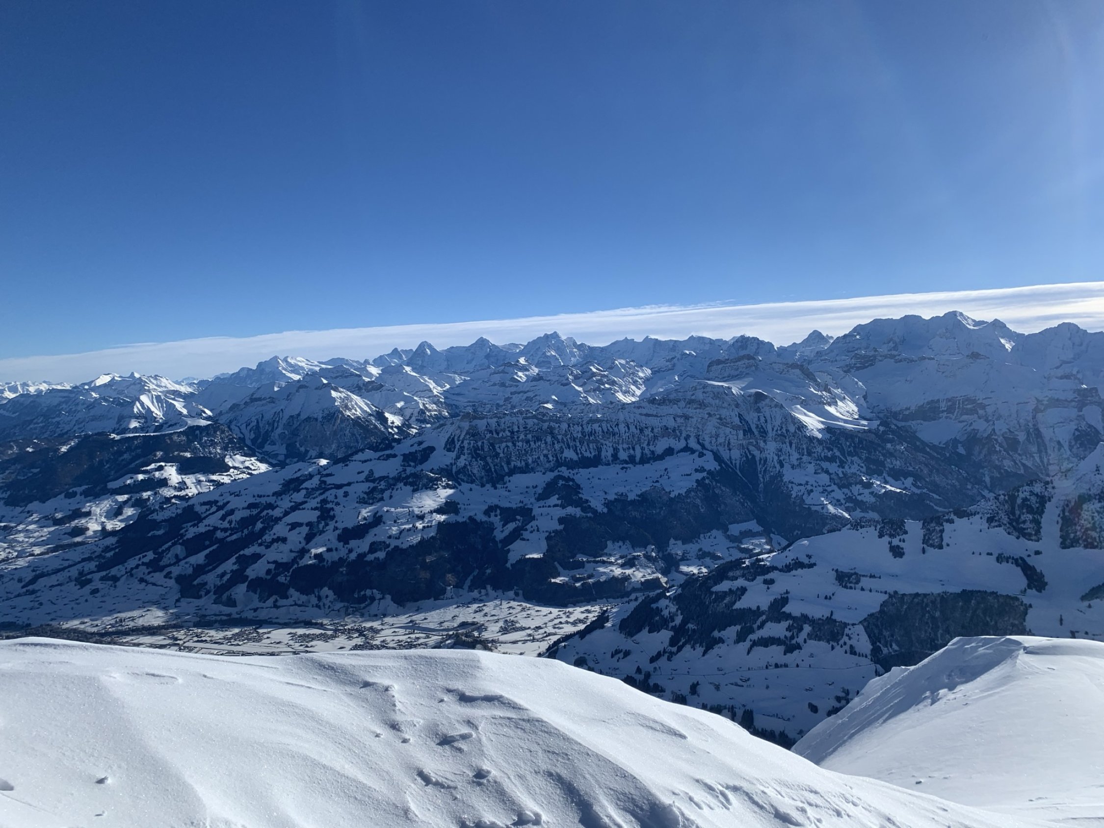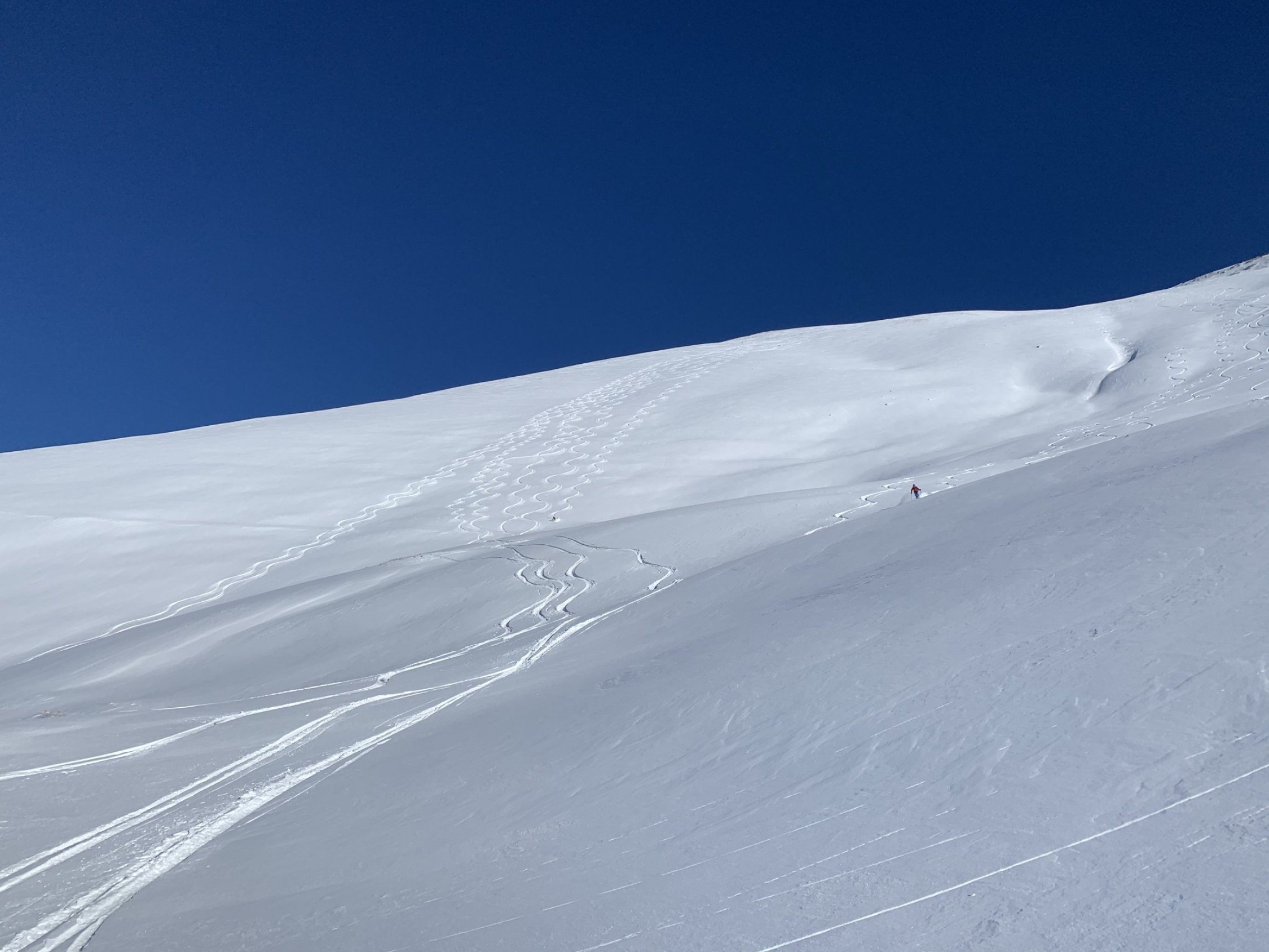 Start um 8:10 bei -6.5 Grad in Sagi. Mit leichtem, aber kalten Wind im Schatten schnell kälter werdend. Oberhalb 1800 m windbearbeitet, unterschiedliche Schneeverhältnisse. Triebschnee, Presspulver, abgeblasene Stellen im Wechsel. Sicher nicht mehr so ausgezeichnet wie am Vortag berichtet, aber immer noch gut. Interessant ist der Vergleich der Bilder vom grossen Westhang (Bild 1) mit dem gleichen Bildausschnitt von Markus Bettler vom Vortag, 23.01.21: