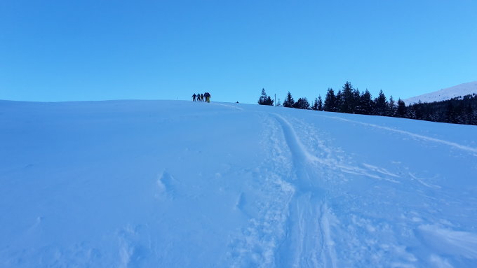 Es hat über Nacht ein schönes Fuder Neuschnee gegeben, welcher die alten Spuren gut zugedeckt hat. Je nach Windeinfluss jedoch an den Geländekuppen ausserhalb der Baumzone war es auch recht verblasen oder leicht windgedeckelt.