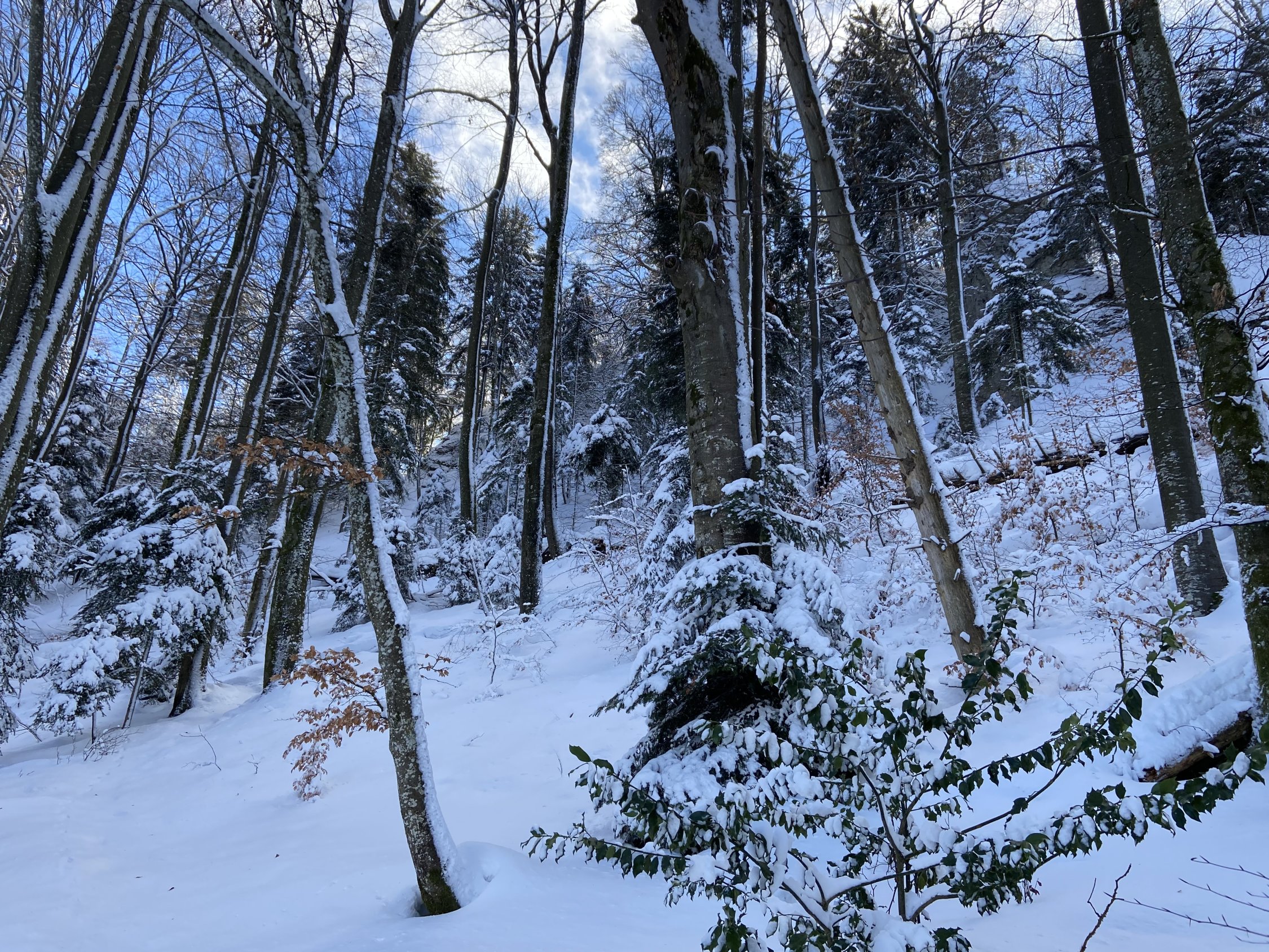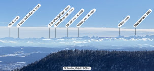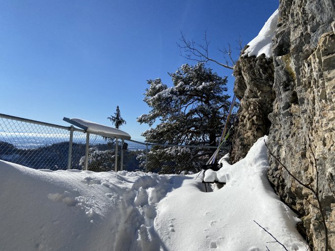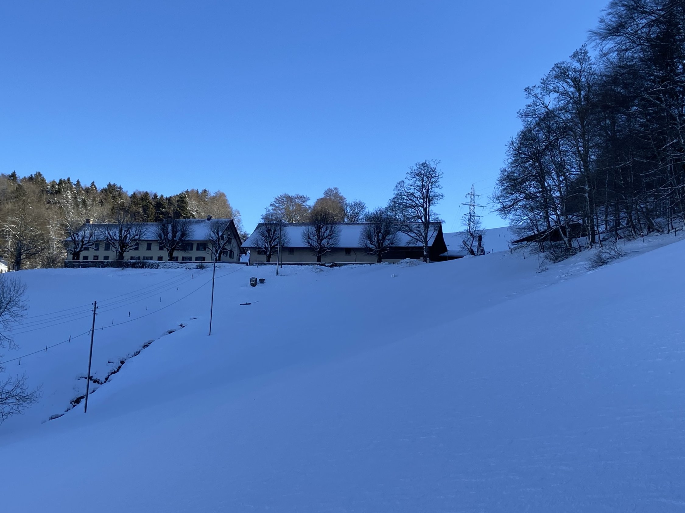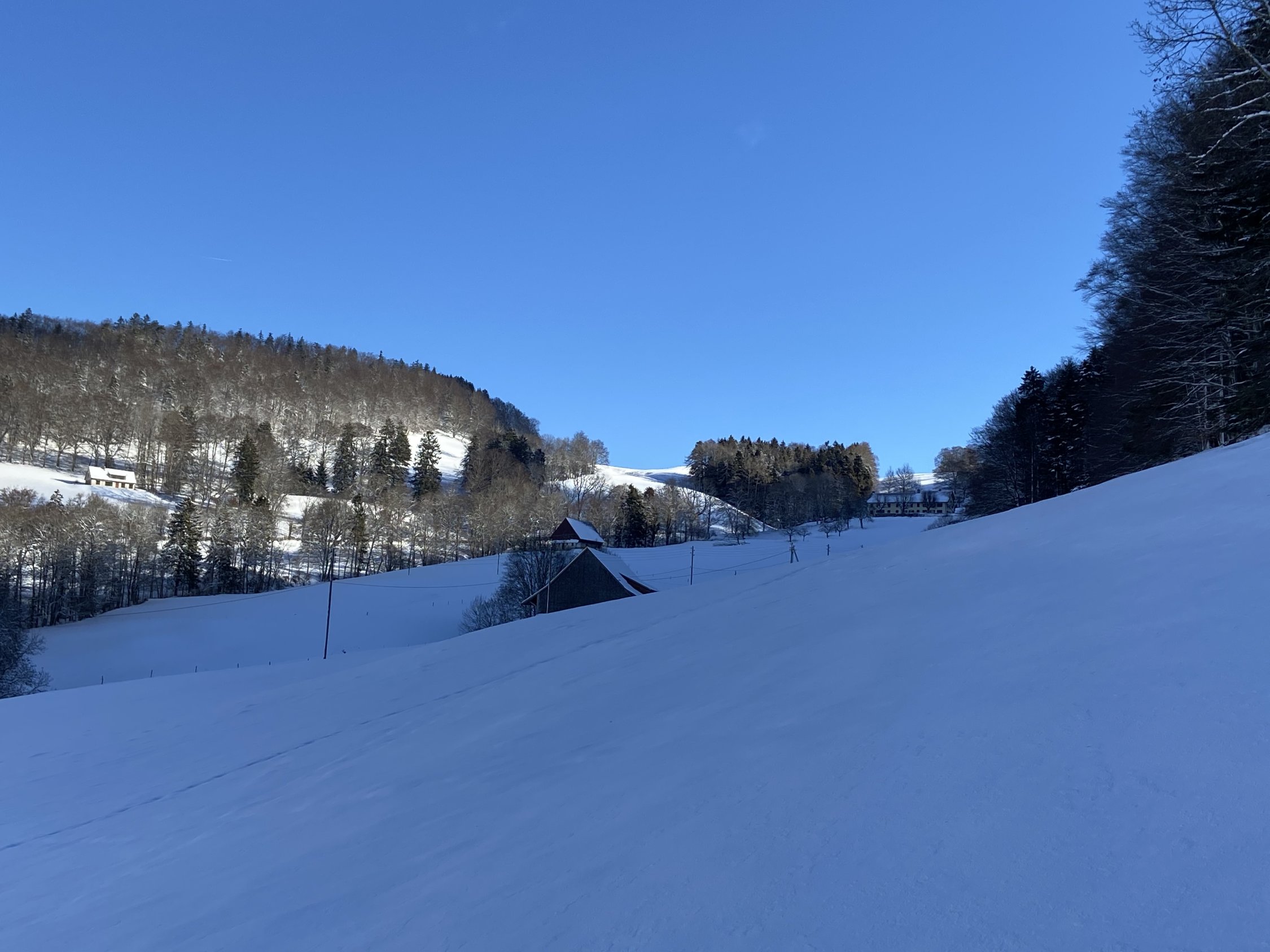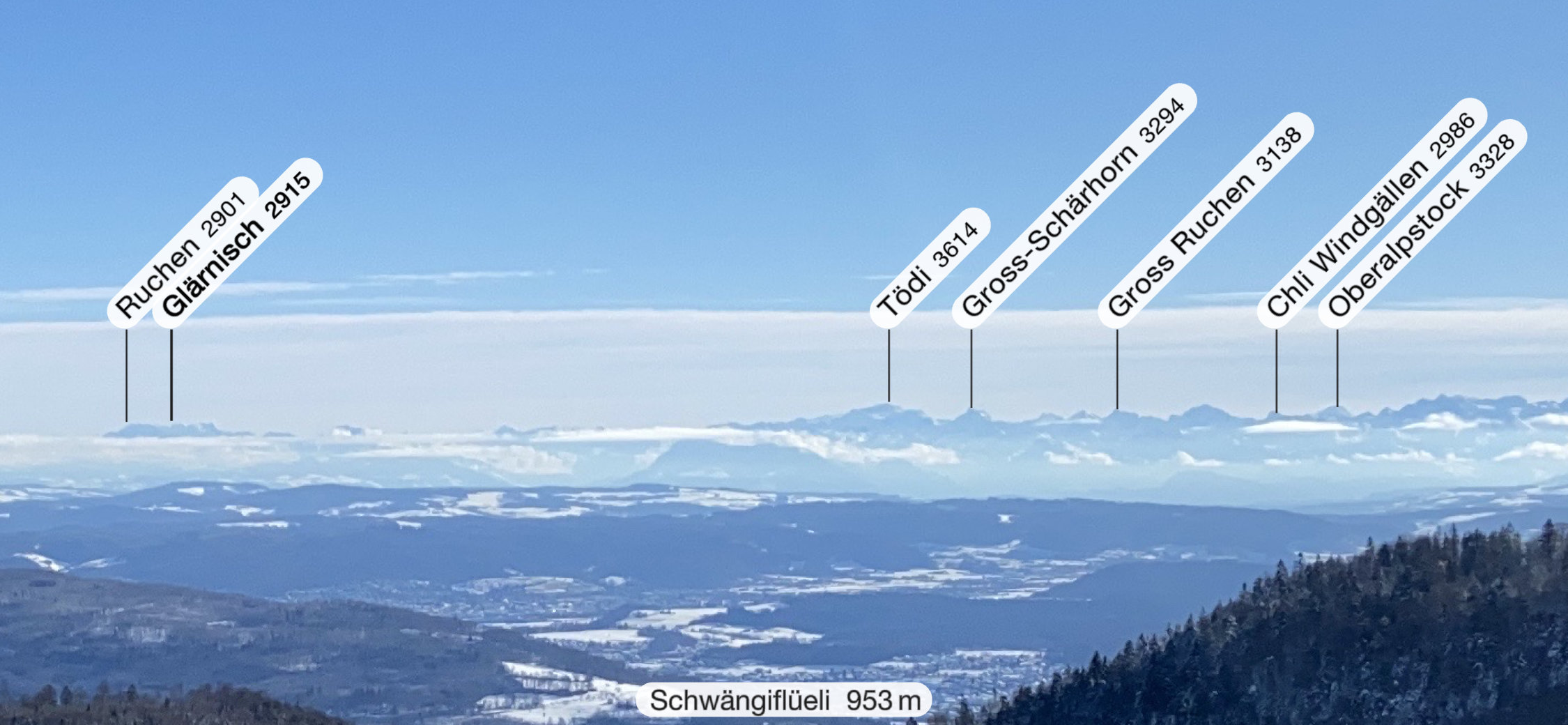 Ich habe mich bei der Tourenplanung durchaus ernsthaft gefragt, ob es überhaupt lohnt die Skier anzuschnallen, aber schon im Aufstieg im besten Pulver auf harter Unterlage schwinden die Zweifel: unterhalb Schwengihöchi, Hof Schwengi und ab dem Niederleger oberhalb Schwängiberg wird es bei erfreulicher Hangneigung in der Abfahrt einige sehr schöne Schwünge im besten Pulver geben. Und in der Tat, es ist ein Traum! Ich bin mit den Skiern bis zum Gipfel durch den steilen Wald aufgestiegen, alternativ kann man auf der Schwengihöchi das Skidepot einrichten und den Schlussaufstieg über den oberen Teil des Wanderweges zu Fuss meistern. Die «Abfahrt» vom Gipfel unternimmt man besser auf dem Wanderweg mit den Skiern in der Hand. Nun ist das Schwängiflüeli auch im Gipfelbuch.ch angekommen, mit einer neuen Skiroute. Von der Felsnase mit bescheidener Höhe in der zweiten Jurakette ein phänomenaler Ausblick auf die gesamte Alpenkette (Glärnisch bis Mont Blanc). Hatte die Steinskis dabei, hätte es aber nicht gebraucht. Es ist die vierte, von mir beschriebene Skitour ab Langenbruck.