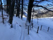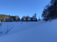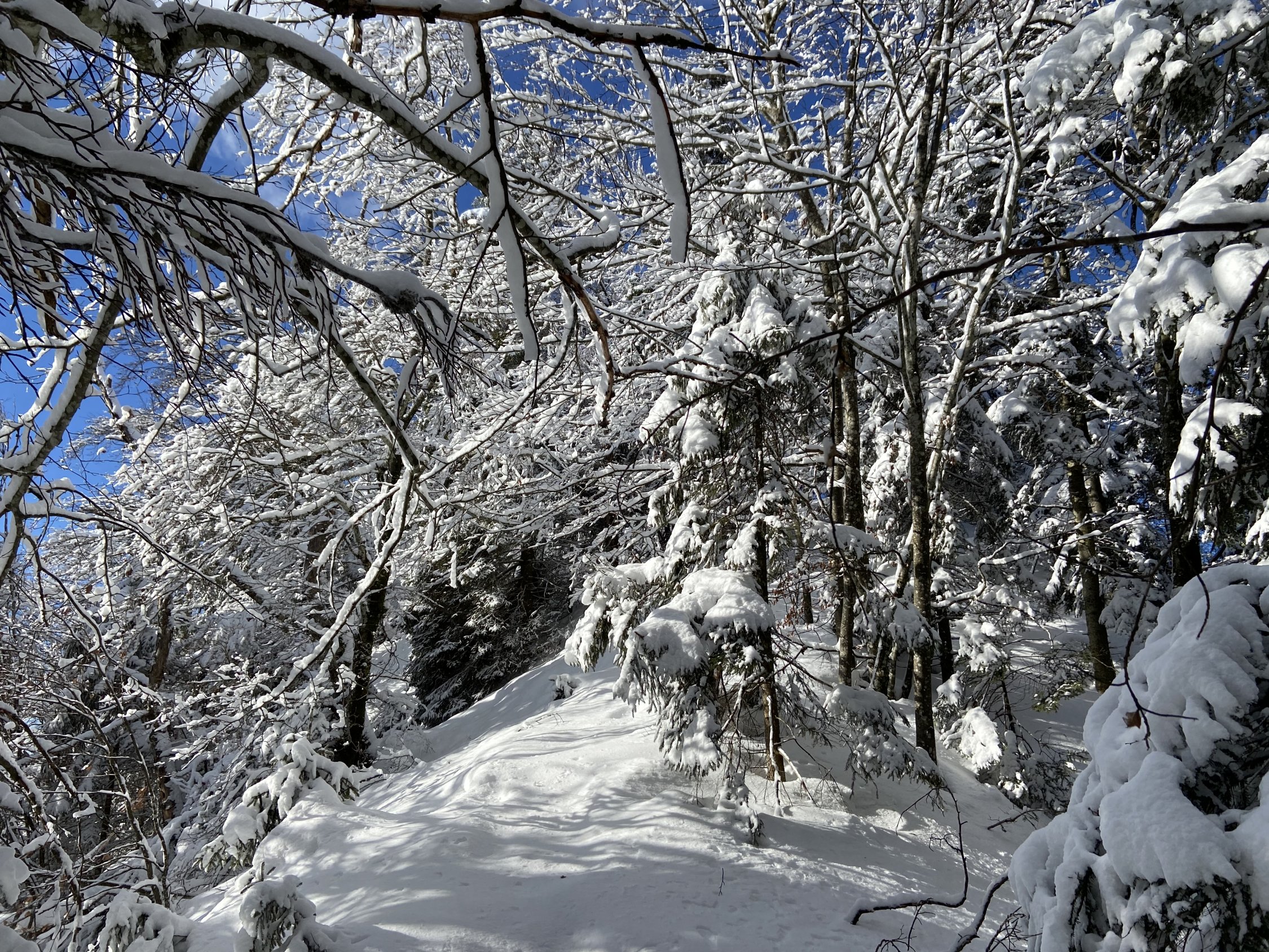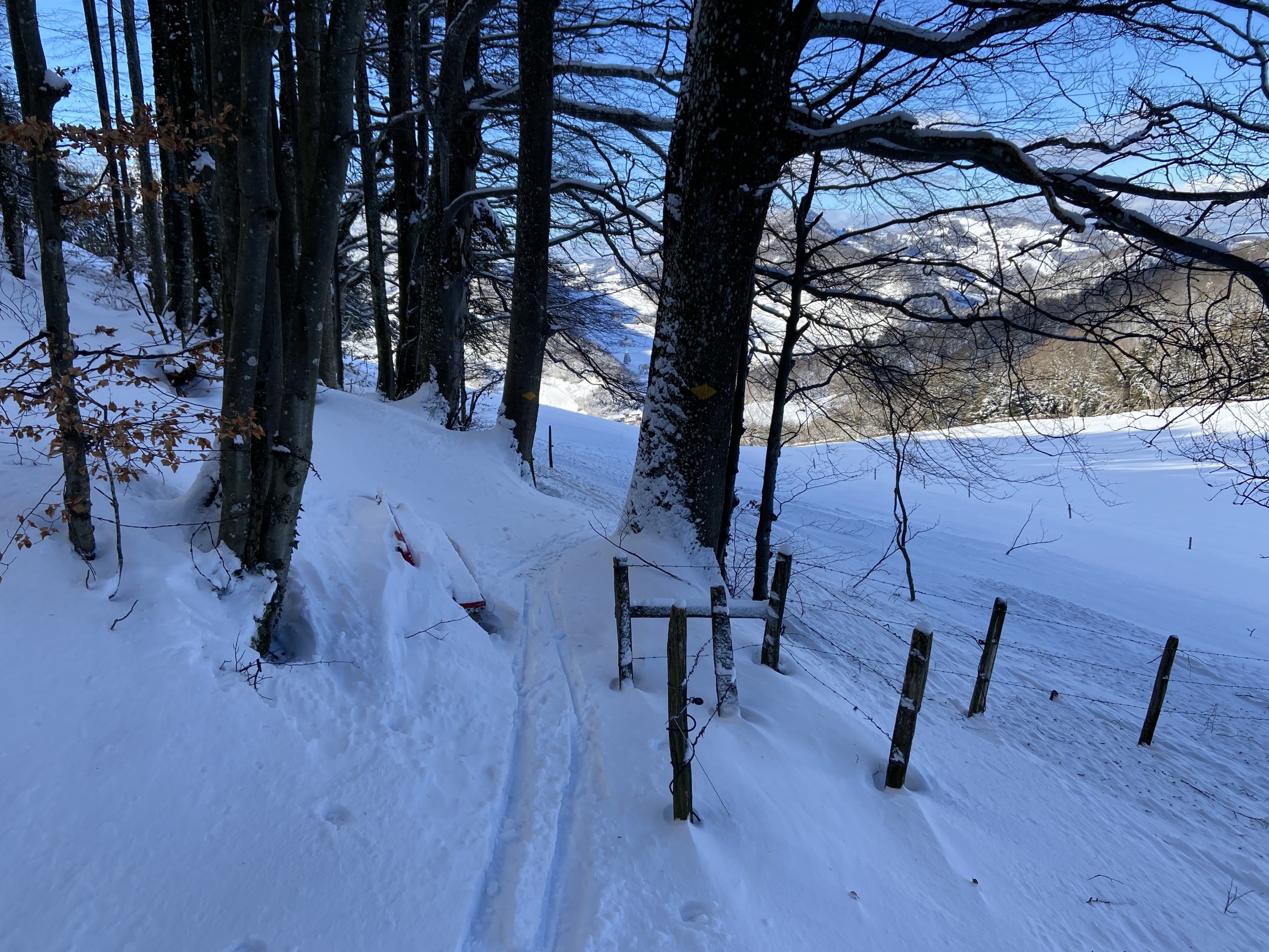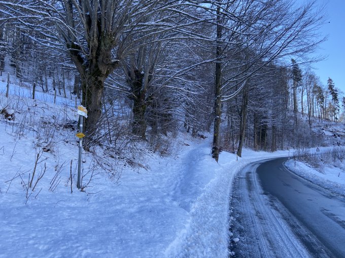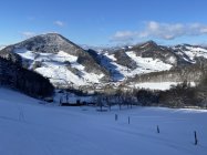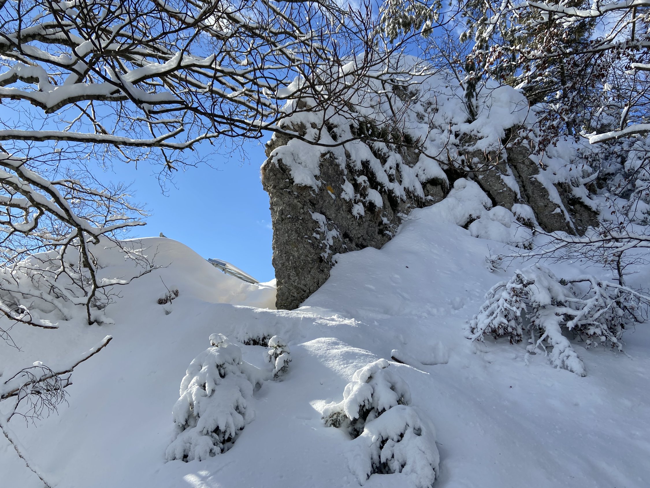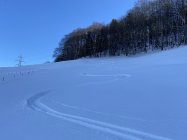 Ich habe mich bei der Tourenplanung durchaus ernsthaft gefragt, ob es überhaupt lohnt die Skier anzuschnallen, aber schon im Aufstieg im besten Pulver auf harter Unterlage schwinden die Zweifel: unterhalb Schwengihöchi, Hof Schwengi und ab dem Niederleger oberhalb Schwängiberg wird es bei erfreulicher Hangneigung in der Abfahrt einige sehr schöne Schwünge im besten Pulver geben. Und in der Tat, es ist ein Traum! Ich bin mit den Skiern bis zum Gipfel durch den steilen Wald aufgestiegen, alternativ kann man auf der Schwengihöchi das Skidepot einrichten und den Schlussaufstieg über den oberen Teil des Wanderweges zu Fuss meistern. Die «Abfahrt» vom Gipfel unternimmt man besser auf dem Wanderweg mit den Skiern in der Hand. Nun ist das Schwängiflüeli auch im Gipfelbuch.ch angekommen, mit einer neuen Skiroute. Von der Felsnase mit bescheidener Höhe in der zweiten Jurakette ein phänomenaler Ausblick auf die gesamte Alpenkette (Glärnisch bis Mont Blanc). Hatte die Steinskis dabei, hätte es aber nicht gebraucht. Es ist die vierte, von mir beschriebene Skitour ab Langenbruck.