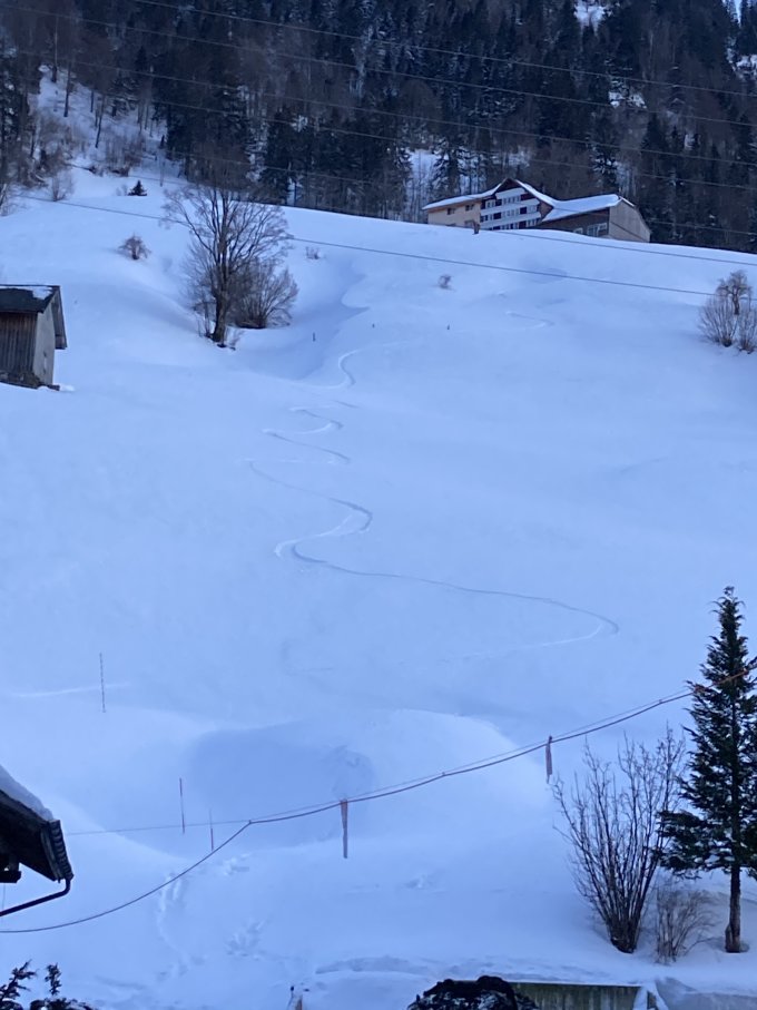 Ich habe danach noch den Selun probiert aber musste auf ca. 1250müm umkehren. Der Weg war dort an einer absturzgefährlichen Stelle hart und abschüssig (von den Abfahrtsspuren eisig gepresste Schneeverwehung...). Soll aber ohnehin alles verblasen gewesen sein auf dem Selun, hat ein abfahrender Skifahrer berichtet.