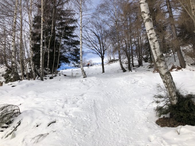Beim Start etwas knapp mit Schnee. Der Monte Bar ist ein Naherholungsgebiet der Luganesi und dementsprechend gut besucht. Jung und alt tummelt sich mit Schneeschuhen und Hunden im Gebiet. Skitüüreler waren heute eher Exoten.