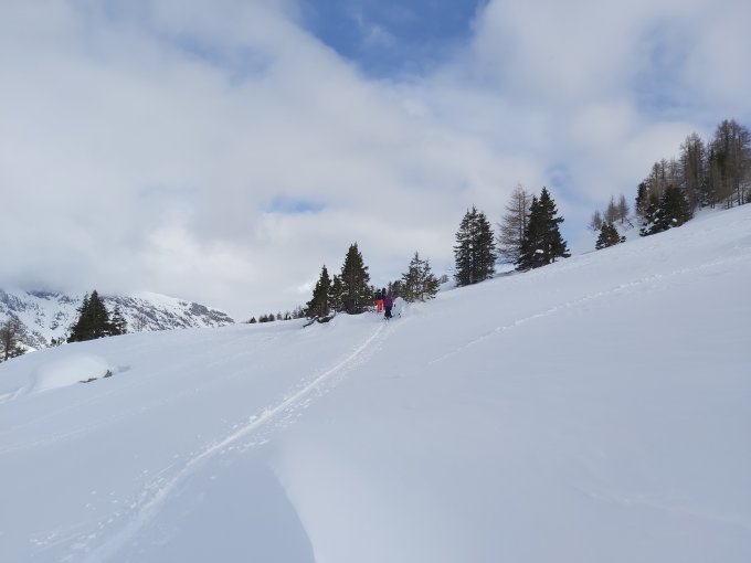 überraschend gutes Wetter, recht guter Schnee, wenn auch nicht der schöne Pulverschnee von Vortagen in Region San Bernardino, meist etwas schwerer Pulver, stellenweise Windharst
