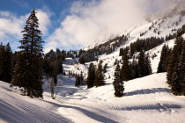 Am Parkplatz Meniggrund um 11:00 Uhr +1°C bei schönem Wetter und einigen Wolkenresten an den Gipfeln. Die Tour ist durchgehend mit Schiis Begeh- und Befahrbar. Im Tal ca.1 cm Neuschnee auf nicht tragender Kruste bis zum Brätliplatz auf ca. 5 cm ansteigend. Ab Brücke bei Pkt. 1594 bis Obermenigen sehr rasch auf ca. 15- 20 cm ansteigend. Gipfel Nebelartig in dünner Wolke verhüllt.