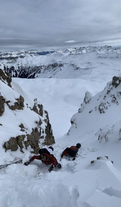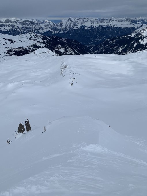 Sicht nicht perfekt, aber genug um alle Konturen zu erkennen. Am Wissmeilen Sattel Depot gemacht und zu Fuss via Südseite gequert und die nordrinne hinauf. Anstrengende wühlerei. Die Drahtkette liegt noch tief unter dem Schnee. Danke an den Tourengänger für das Vorspulen der Rinne. Abfahrt via Wissmeilen Nordflanke zurück ins Skigebiet.
