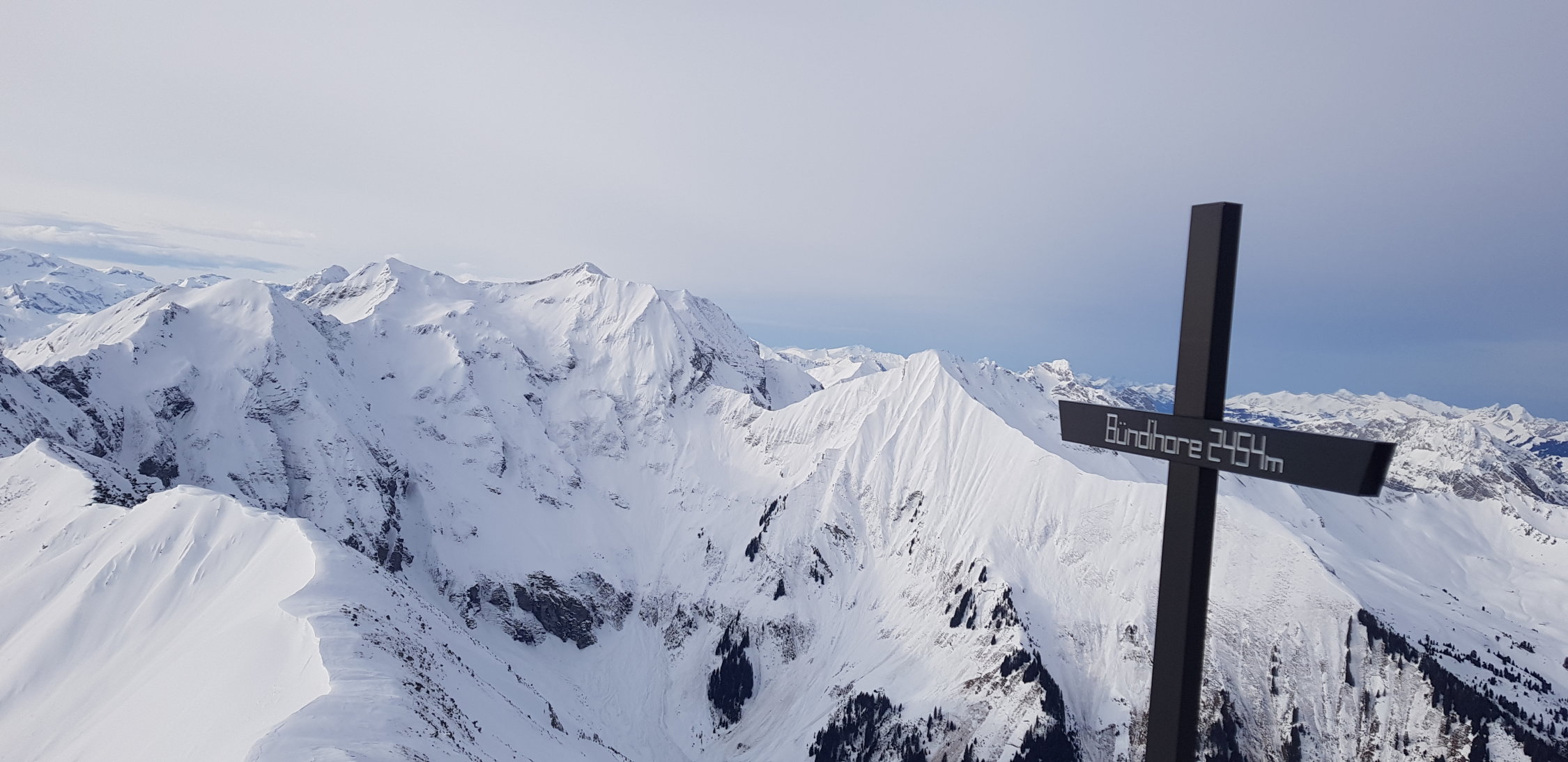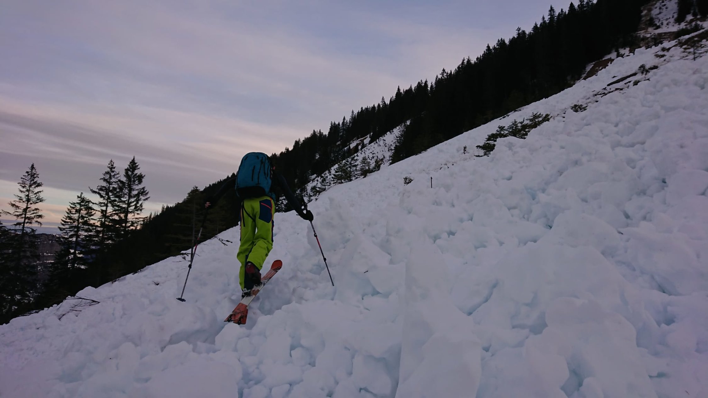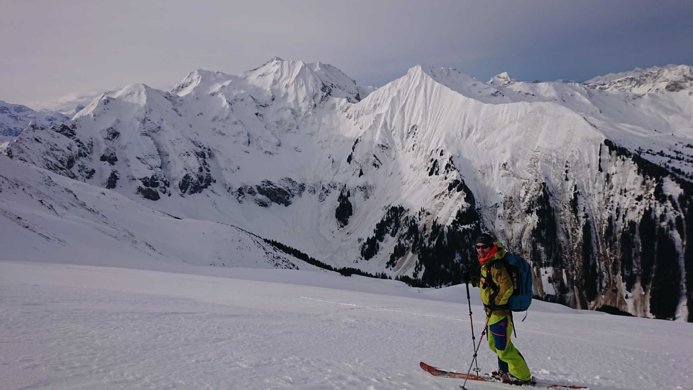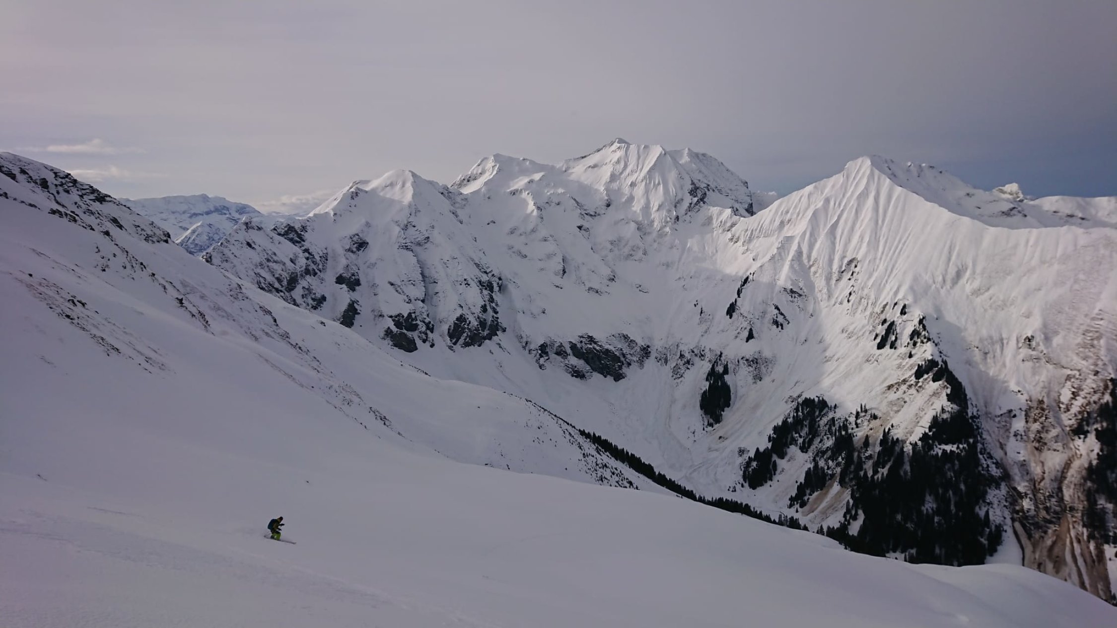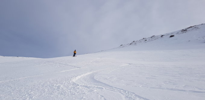 Gut tragend auf der ganze Route. Viele grosse Grund Lawine auf die steile Hänge, manche zu queren, aber geht gut. In W Hang,Firn und einige Passage mit 5cm Pulver Auflage, schön zu fahren, auch wenn noch ziemlich hart. Oben abgeblasen. Wetter ganz ok (noch nicht zu viel Wind)