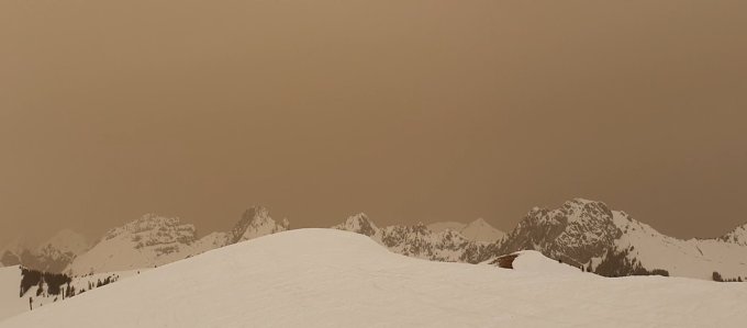 Die Szenerie mit dem dichten Saharastaub war die Hauptattraktion. Eine grosse rot/braun/gelbe (eingebettete) Wolke überquerte das Gelände von der Gummfluh her kommend das Gebiet. Das etwas düstere Farbenspiel begegnete uns das erste Mal in dieser Intensität.