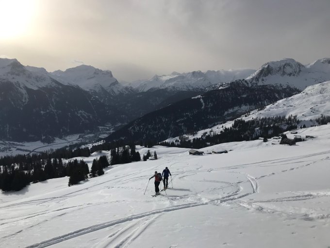 Der Saharastaub in der Luft erzeugte eine spezielle Stimmung. Es liegt immer noch viel Schnee im Gebiet. Die Schneequalität war nicht berauschend: Zum Teil windgepresst, Harsch, zum Teil Sulz, Talabfahrt nach Zillis Nassschnee. Schöne Schwünge waren im oberen Teil leider nicht möglich.