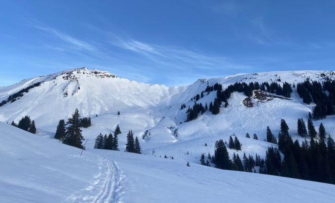 wenn Temperaturen weiterhin hoch bleiben sind Nassschnee-Rutsche im Verlauf des Tages gut möglich. Schnee wurde in großen Mengen verfrachtet. Im Gipfelhang ist das gut zu beobachten.