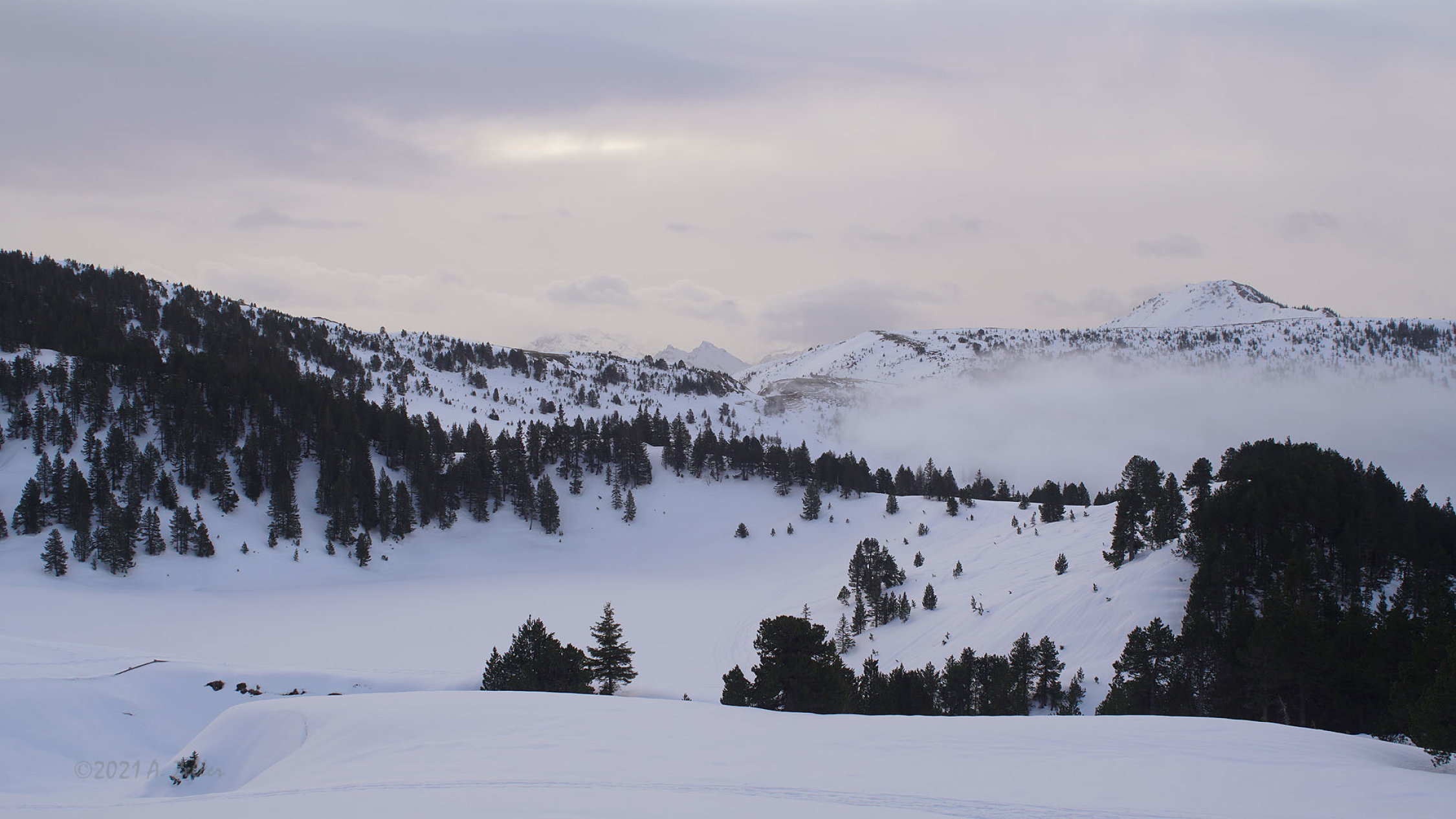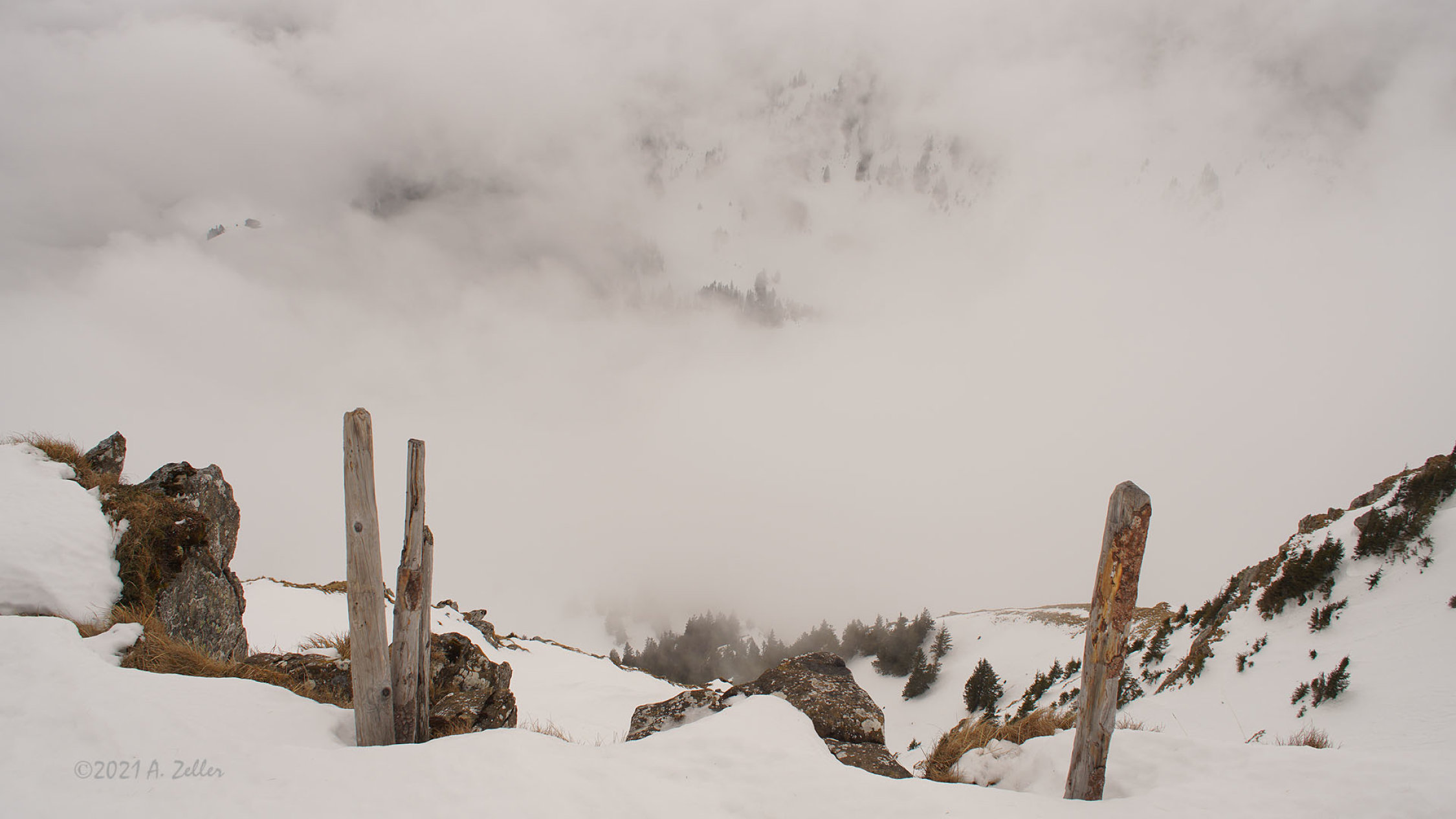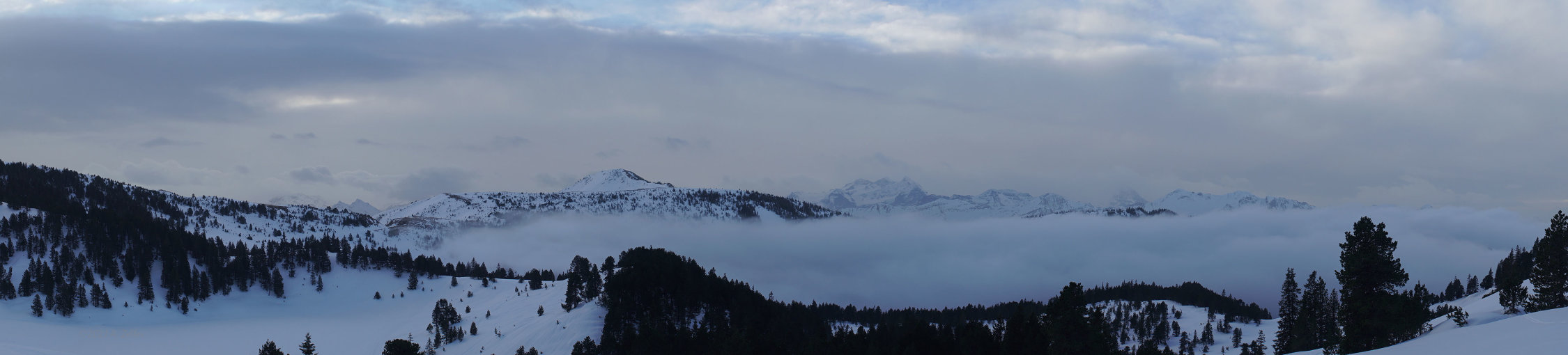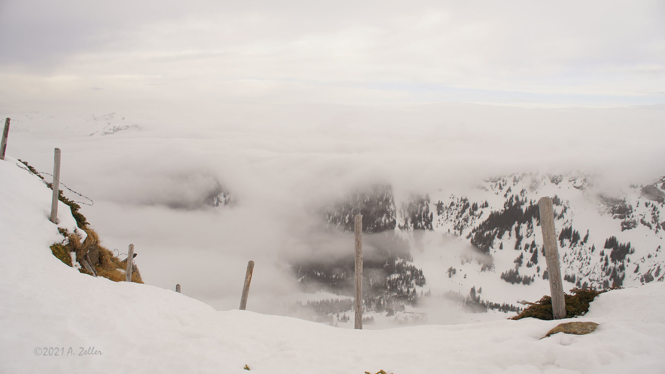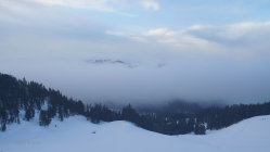 Frühmorgens bewölkt und kurz aufgehellt. Gegen 10.00 Uhr Nebelaufzug und anschliessend oberhalb vom Waldbereich whiteout.
