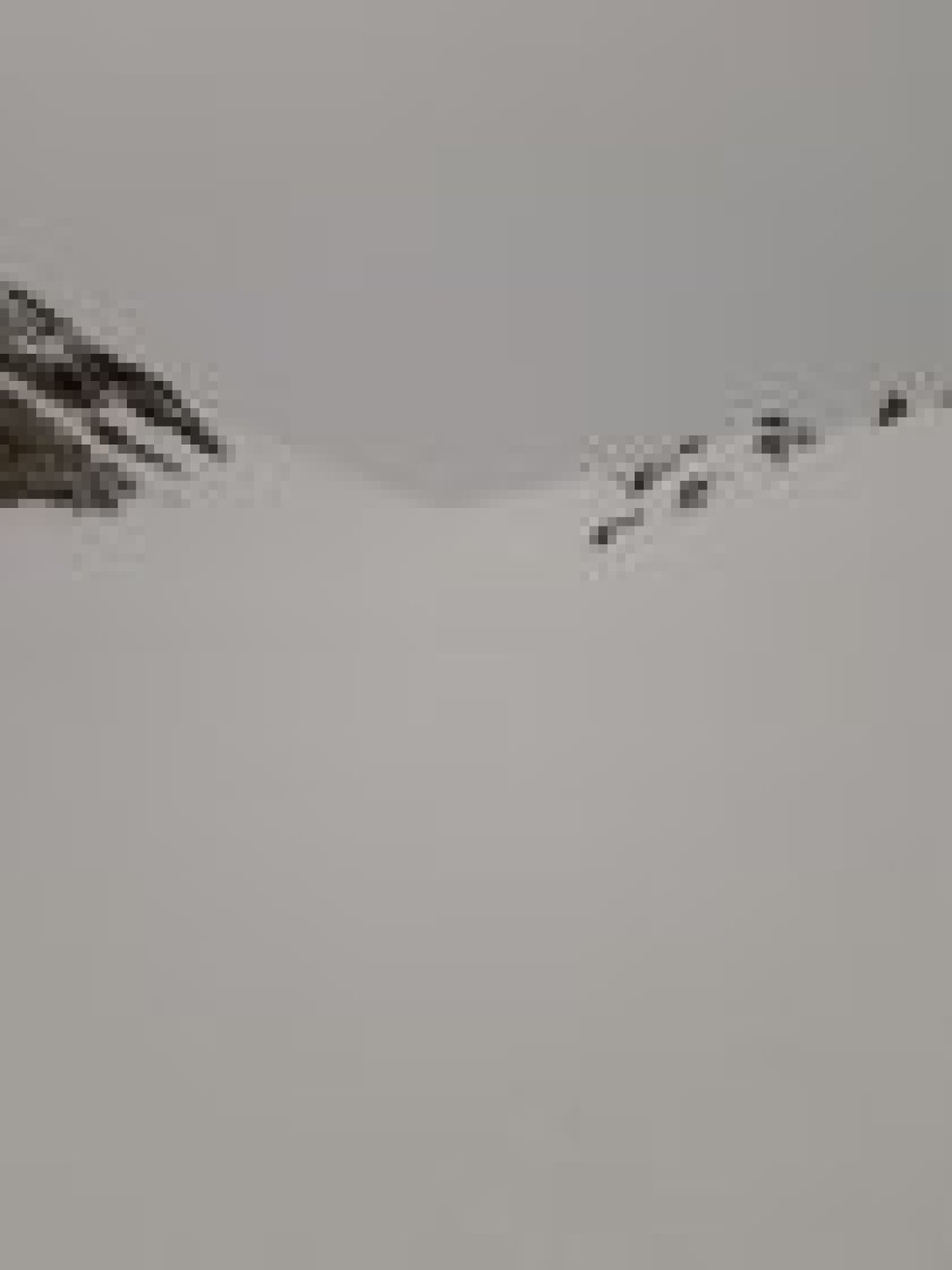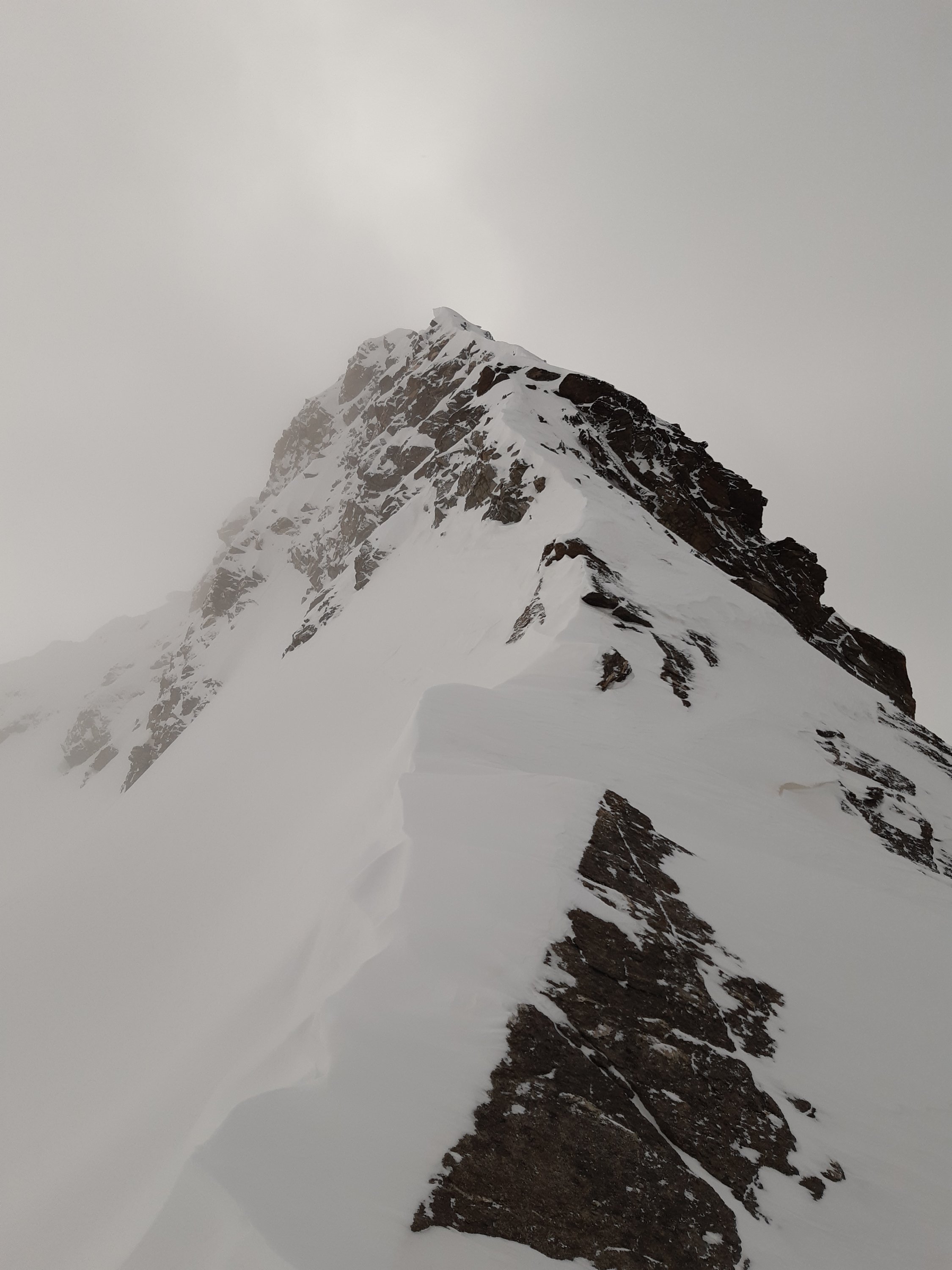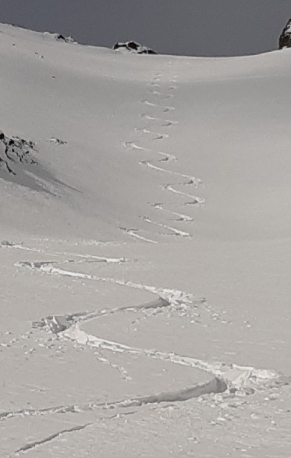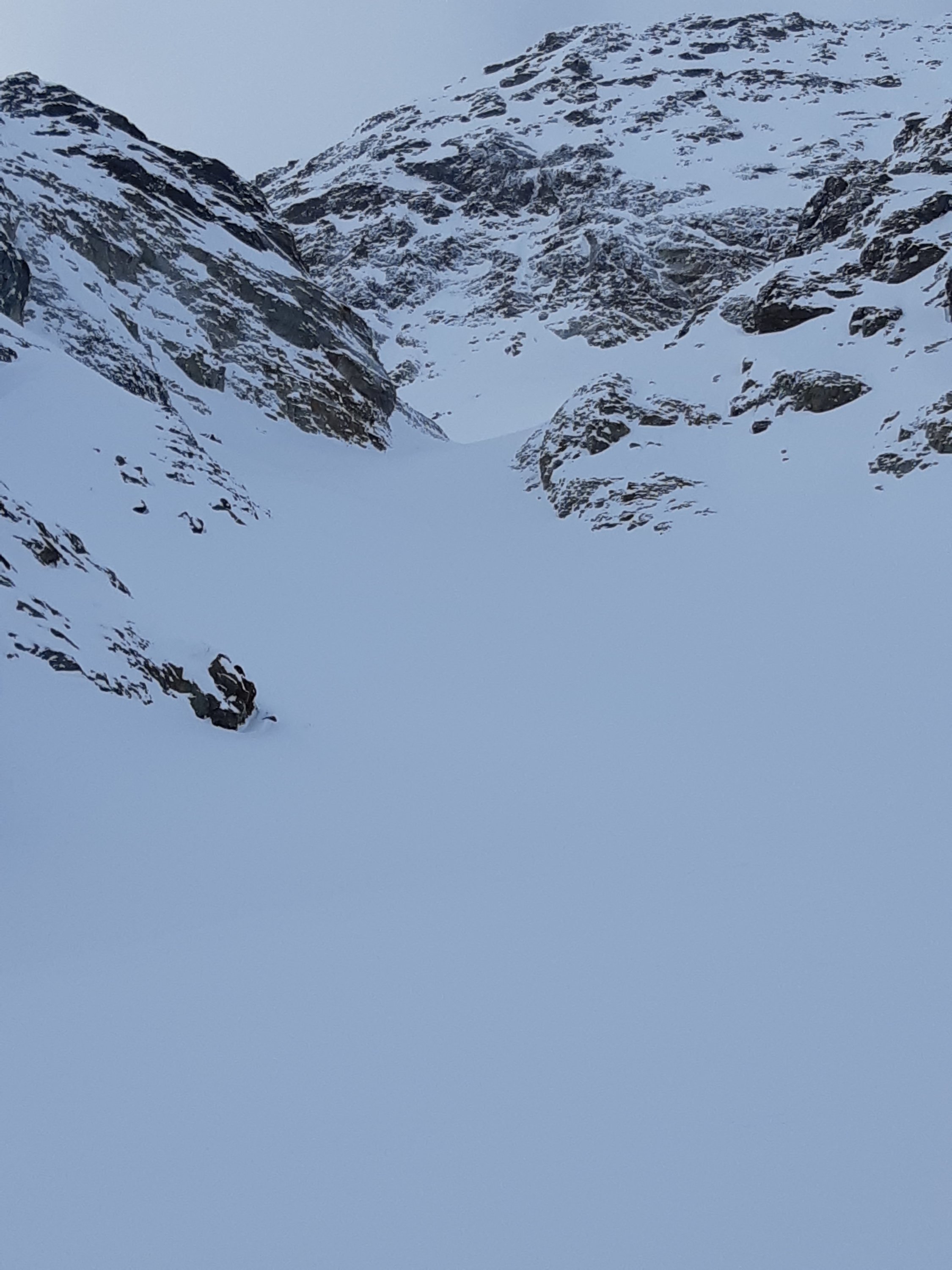 Die steilste Stelle kurz vor dem Sattel bei Punkt 3165m misst ca 40 Grad, aber weil ein kleines Schneebrett während dem letzten Schneefall abgegangen war, war dieser Anstieg von der Lawinengefahr gesehen, vertretbar.