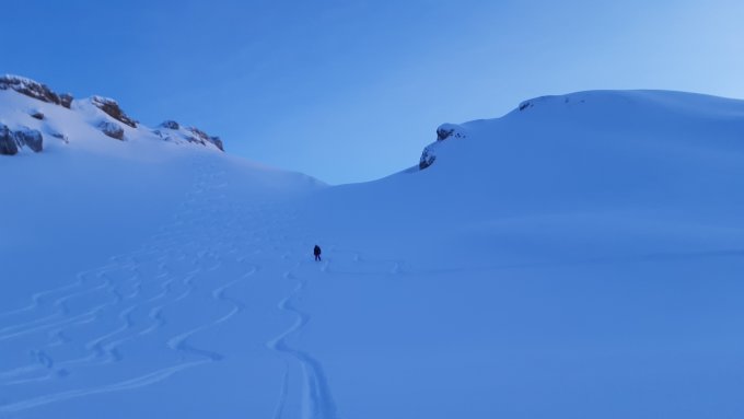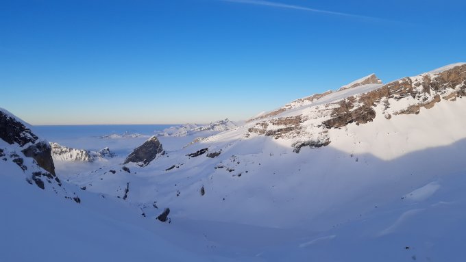 Ein Abfahrtstraum via Rotembalm. Genug Schnee auch für Rosstock (wurde gemacht), Richtung Blüemberg waren Spuren, Hundsstock und Wyfass wurden noch nicht gemacht. Ein Abfahrtstraum auf fester Unterlage mit 20-30 cm Champagner-Powder - man gleitet nur so ins Tal. Auch unten noch mehr als genug Schnee...