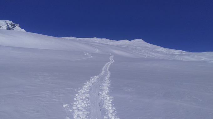Im obersten Teil konnten wir ein paar Schwünge schon im angsulzten Schnee machen, Dann die Hangrichtung ein wenig gewechselt und schon war es gut gesetzter schöner Pulverschnee. Viel Platz noch für eigene Schwünge. Die Abfahrt war ein Traum!!!