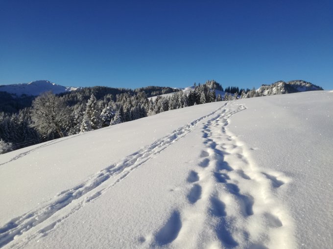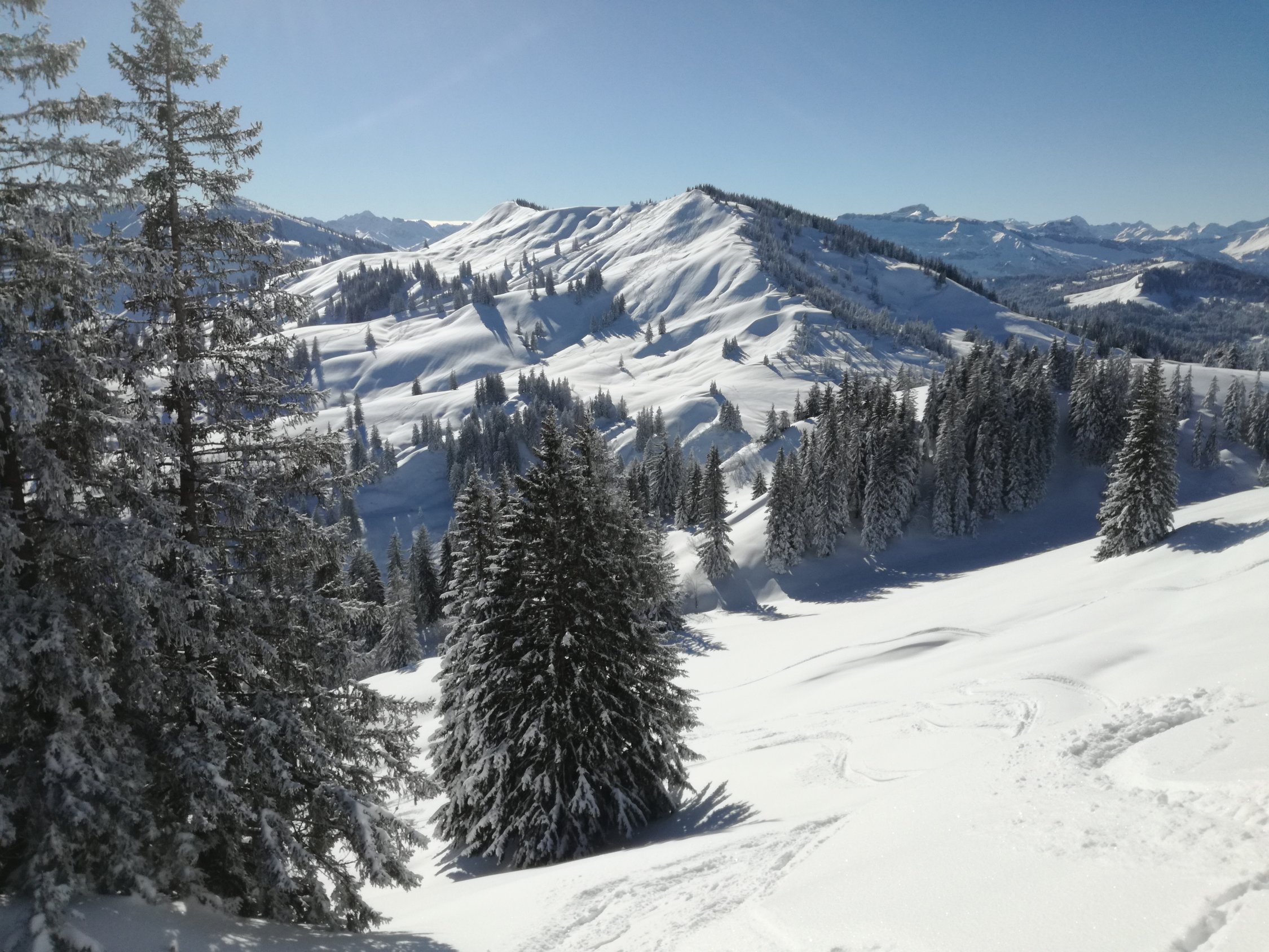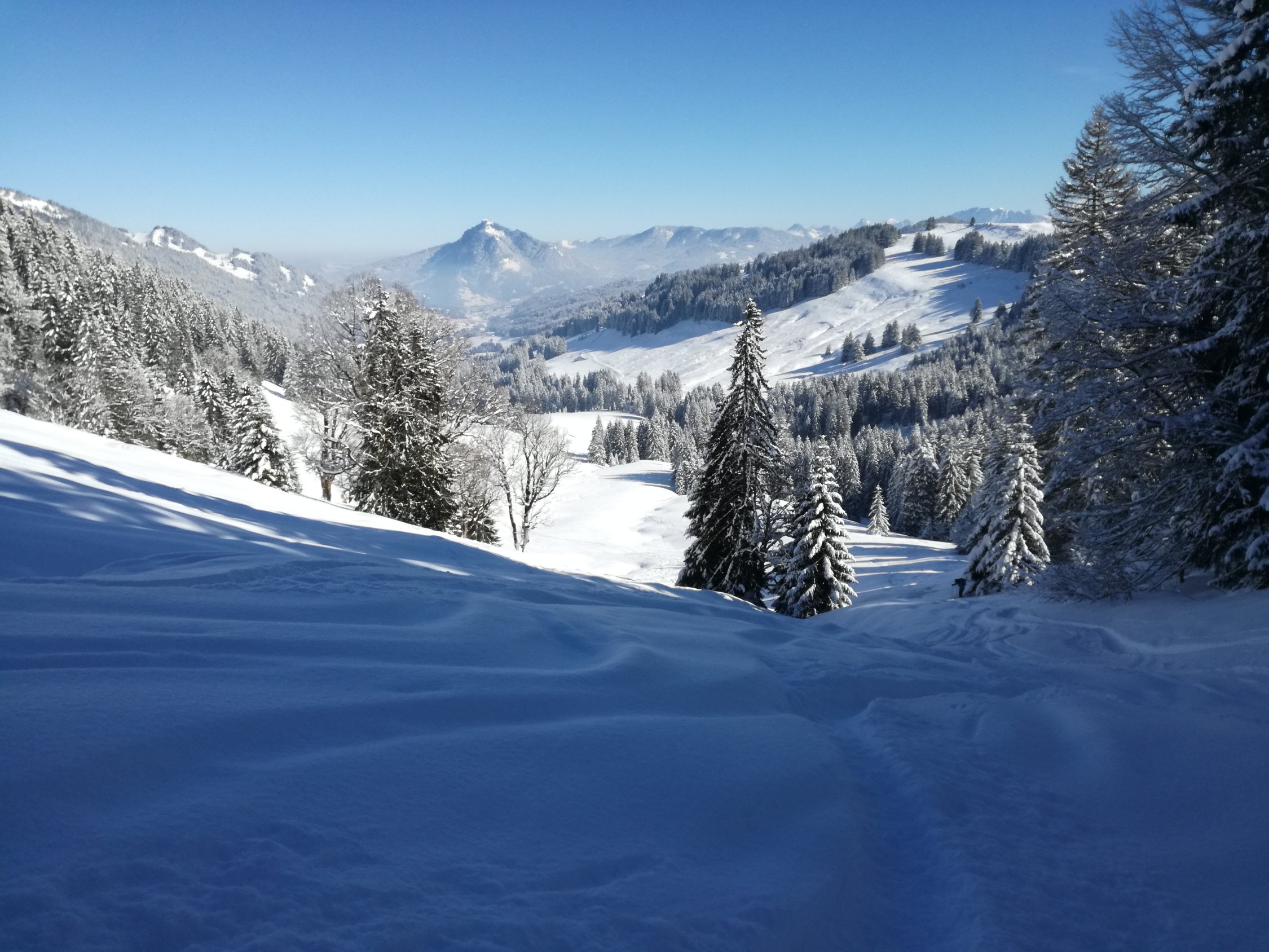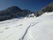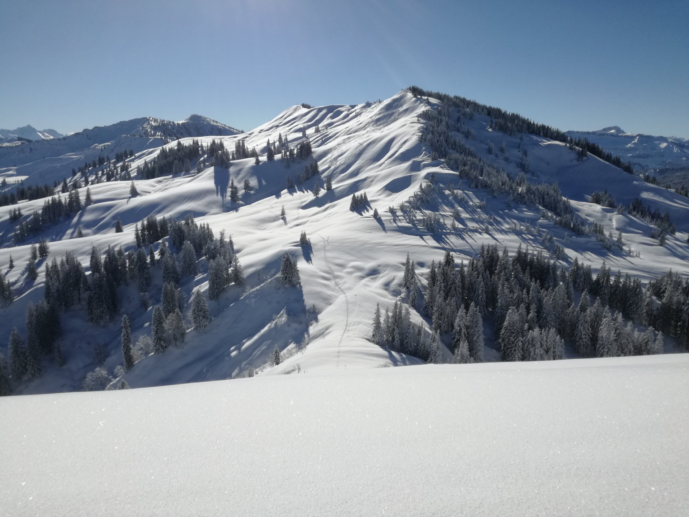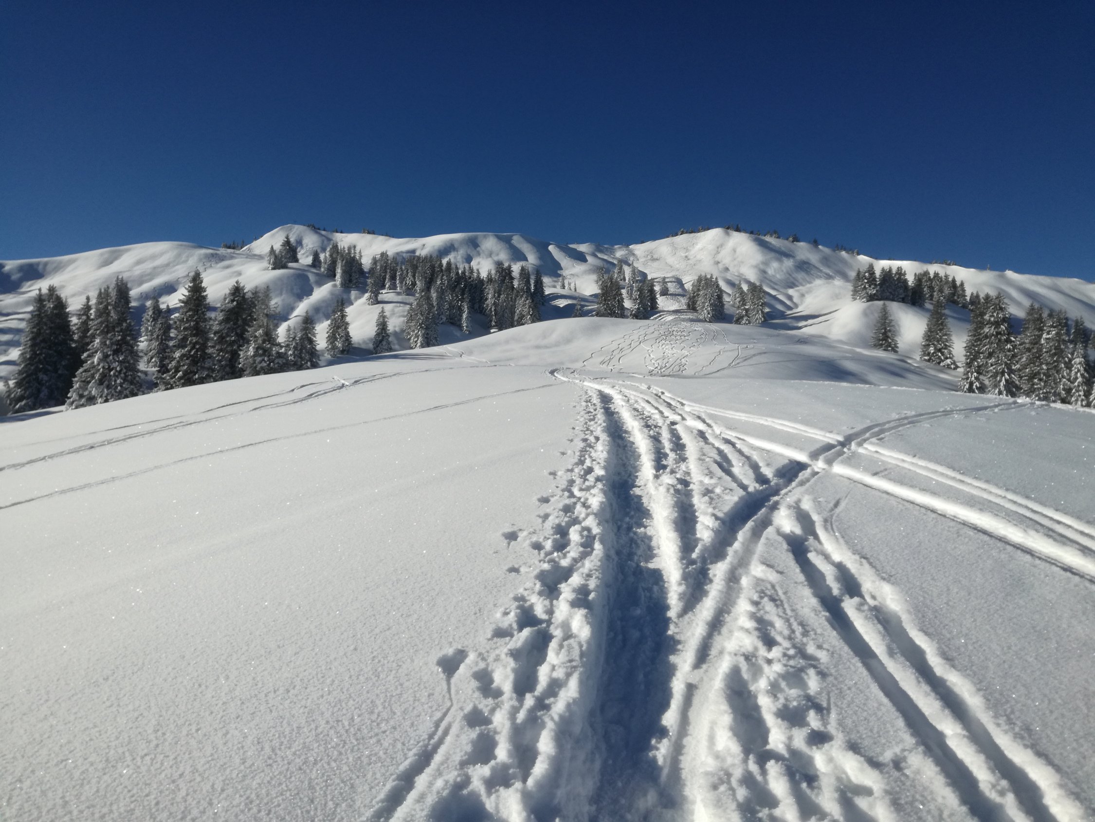 Start 7.45h vom Parkplatz Gunzesrieder Säge über Ostertal-Rücken zum Höllritzereck-Bleicherhorn-Abfahrt Gipfelhang Richtung Ob. Wilhelminenalpe. Aufstieg zum Tennenmooskopf - Abfahrt NO-Hang zurück nach der Gunzesrieder Säge.