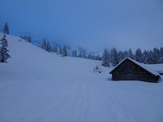 Im Abstieg im Wald und unterhalb vom Risipass neben der Spur schönsten Pulver vorgefunden dass man richtig gleiten konnte…